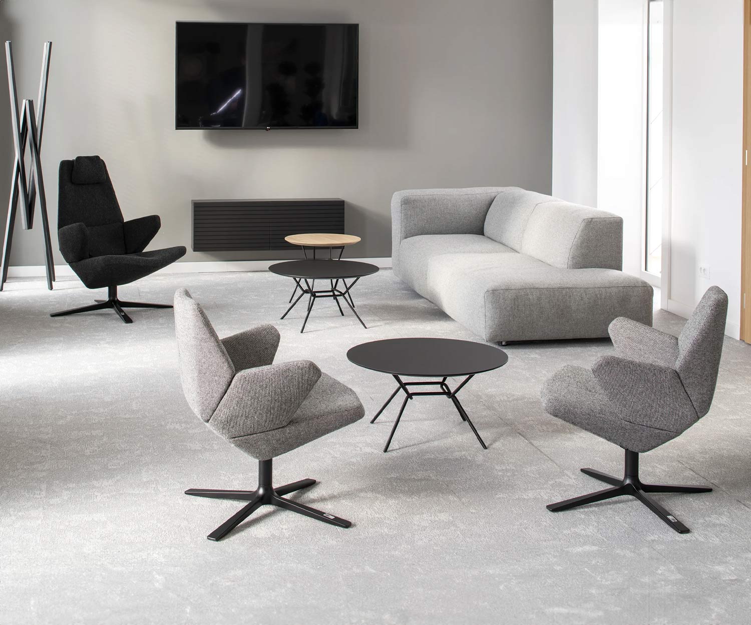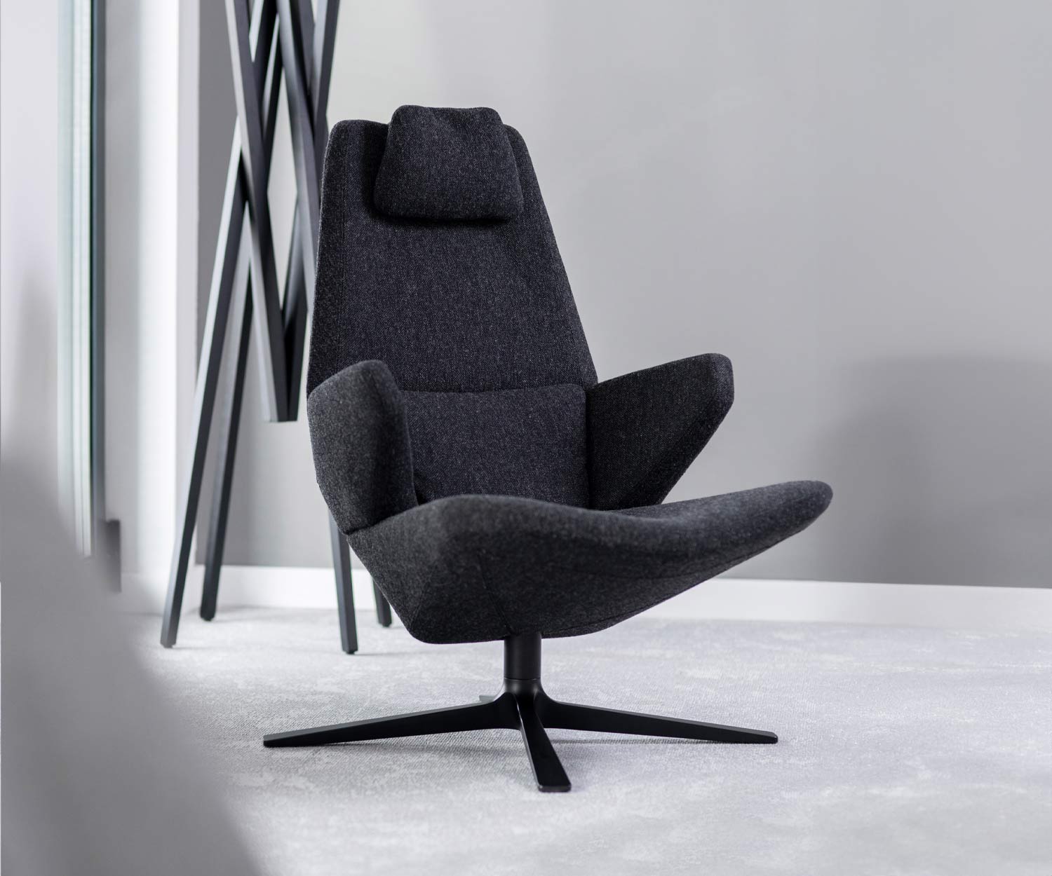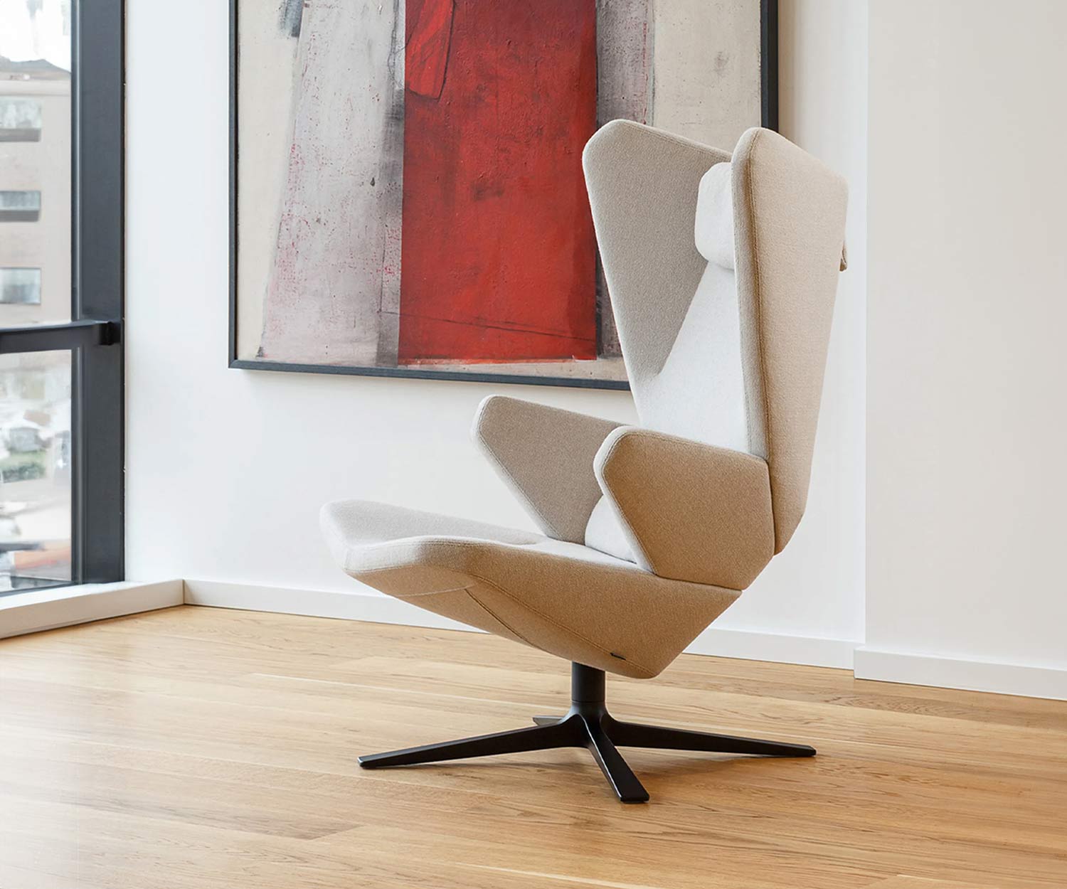 Tutti i modelli di design Trifidae hanno una seduta leggermente inclinata che mette il corpo in posizione rilassata. Rispetto alla tradizionale poltrona Trifidae, la lounge chair e la wing chair hanno uno schienale rialzato con un cuscino poggiatesta. Per una migliore schermatura dell'ambiente circostante, la poltrona ad ala è dotata di fianchi laterali, le orecchie, che riducono significativamente il rumore di fondo.