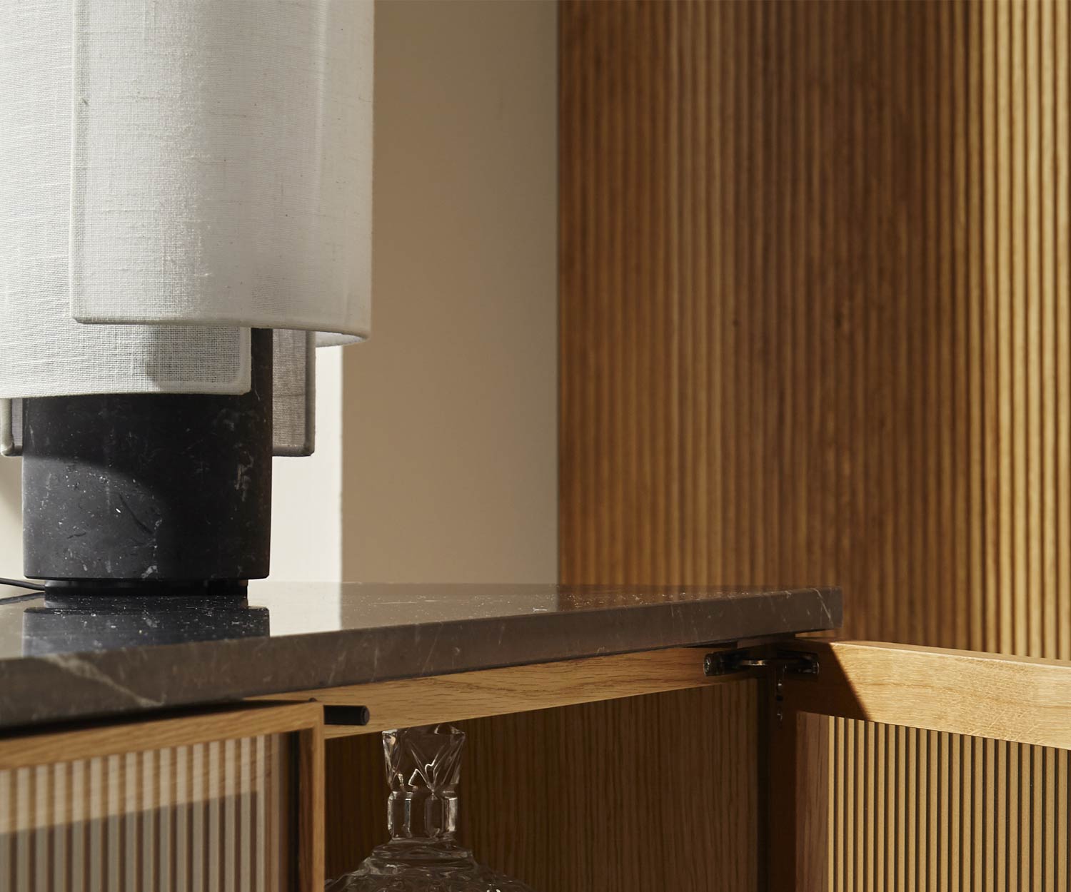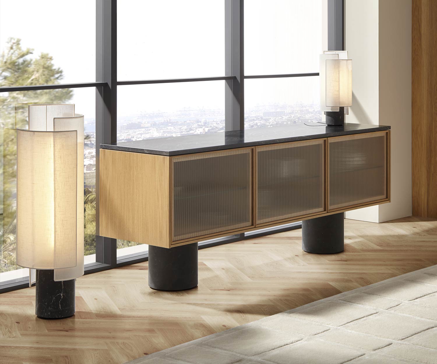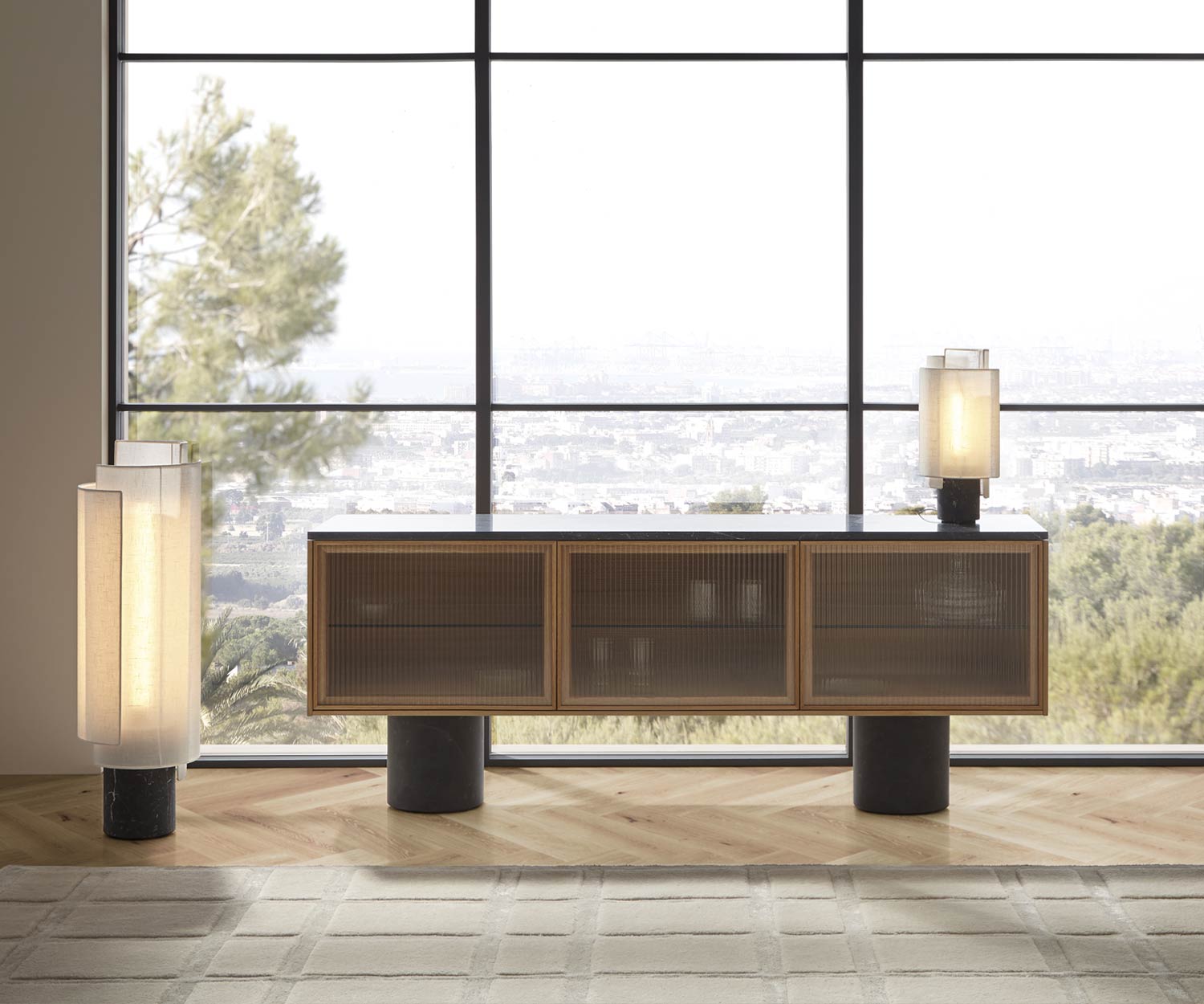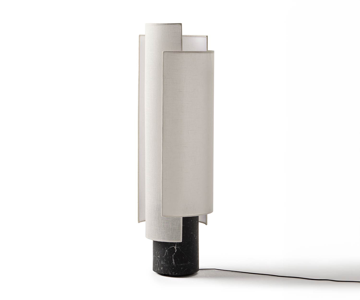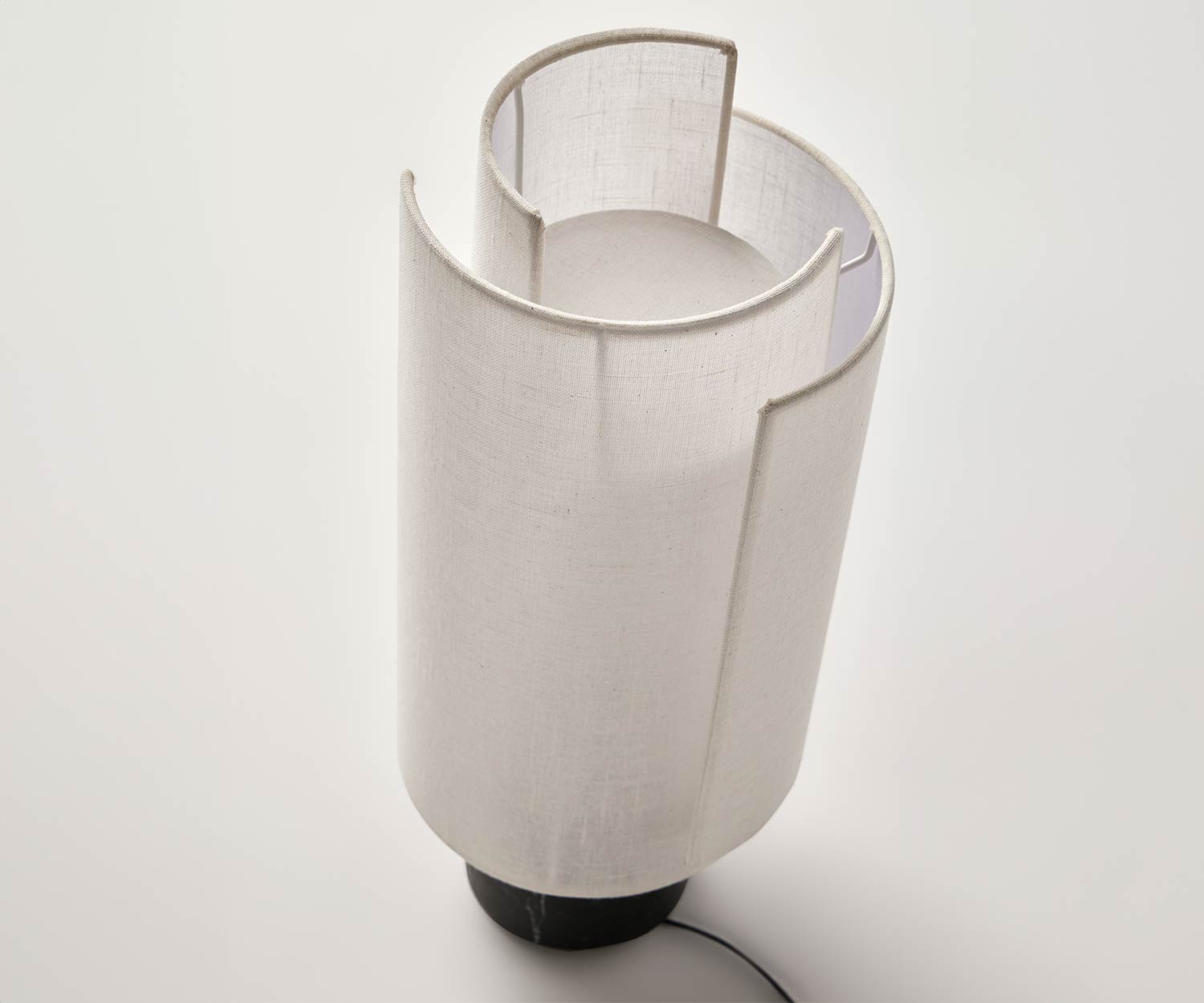 Materiali: Il paralume è costituito da cilindri con struttura in alluminio dorato, rivestiti dicotone naturale. Lo zoccolo è disponibile in marmo nero Marquina massiccio.
