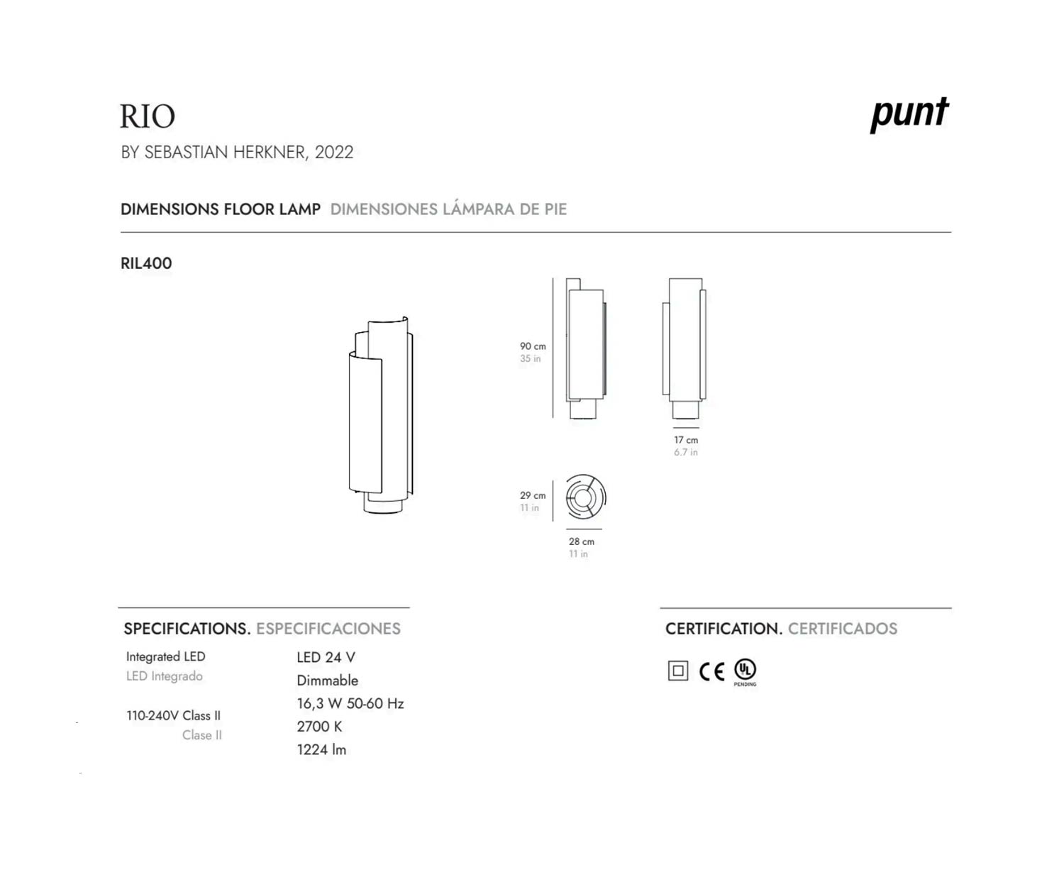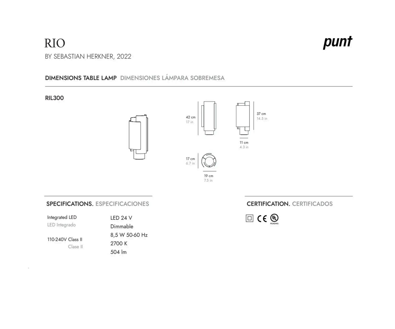 L a lampada Rio è disponibile con LED 24 V integrato ed è dimmerabile. 'interruttore è collegato direttamente al cavo e può essere utilizzato anche come dimmer a pedale. spine sostituibili e le istruzioni per il montaggio sono incluse nella confezione della lampada