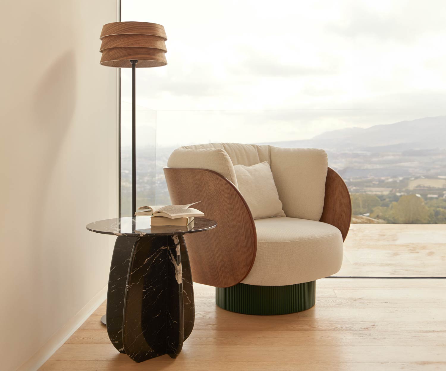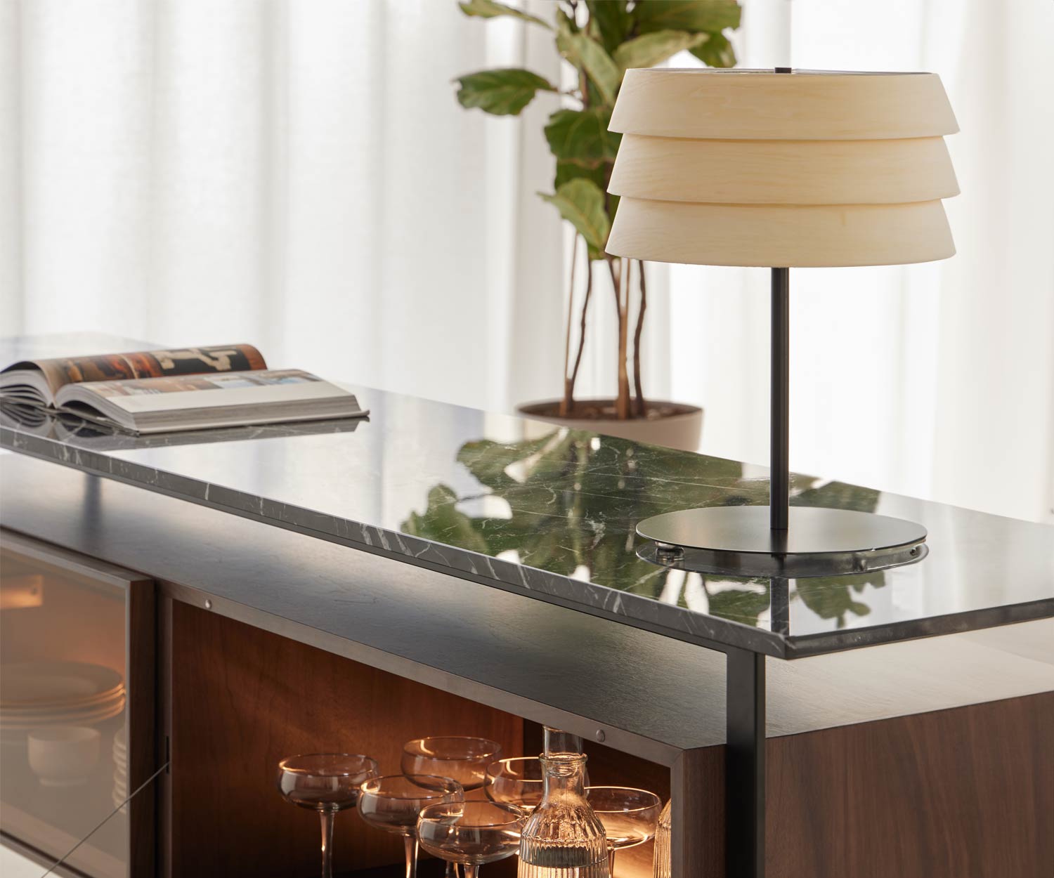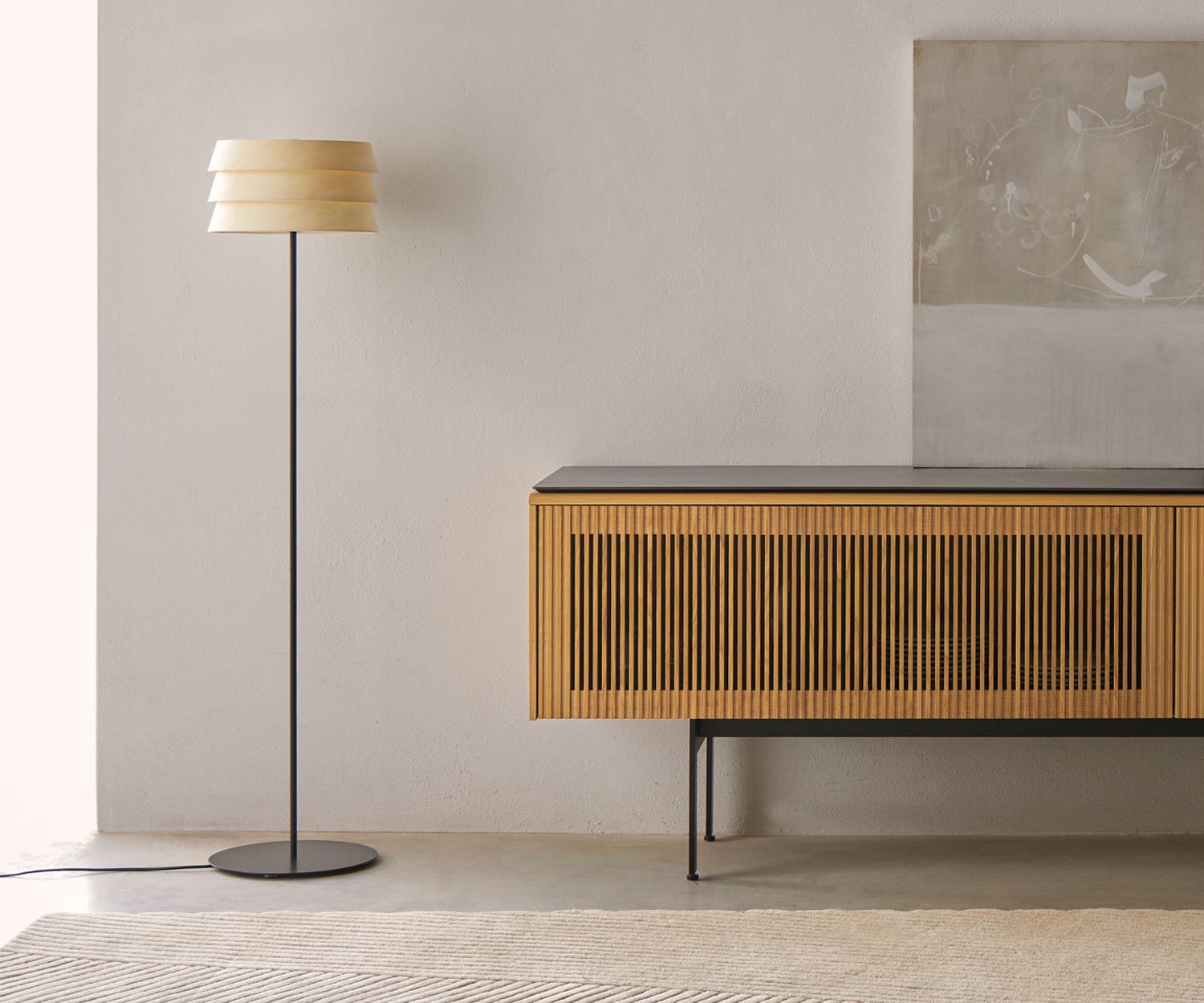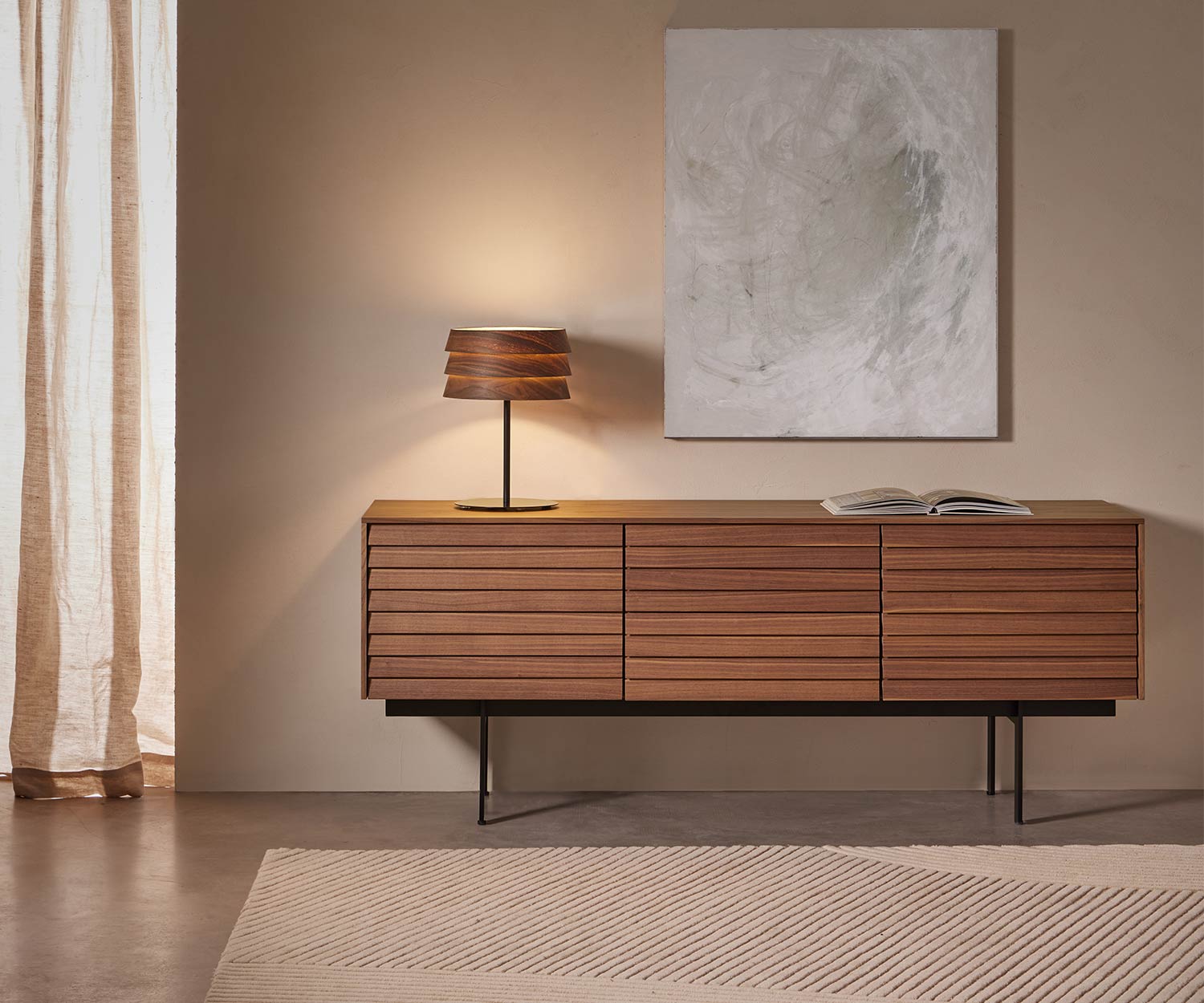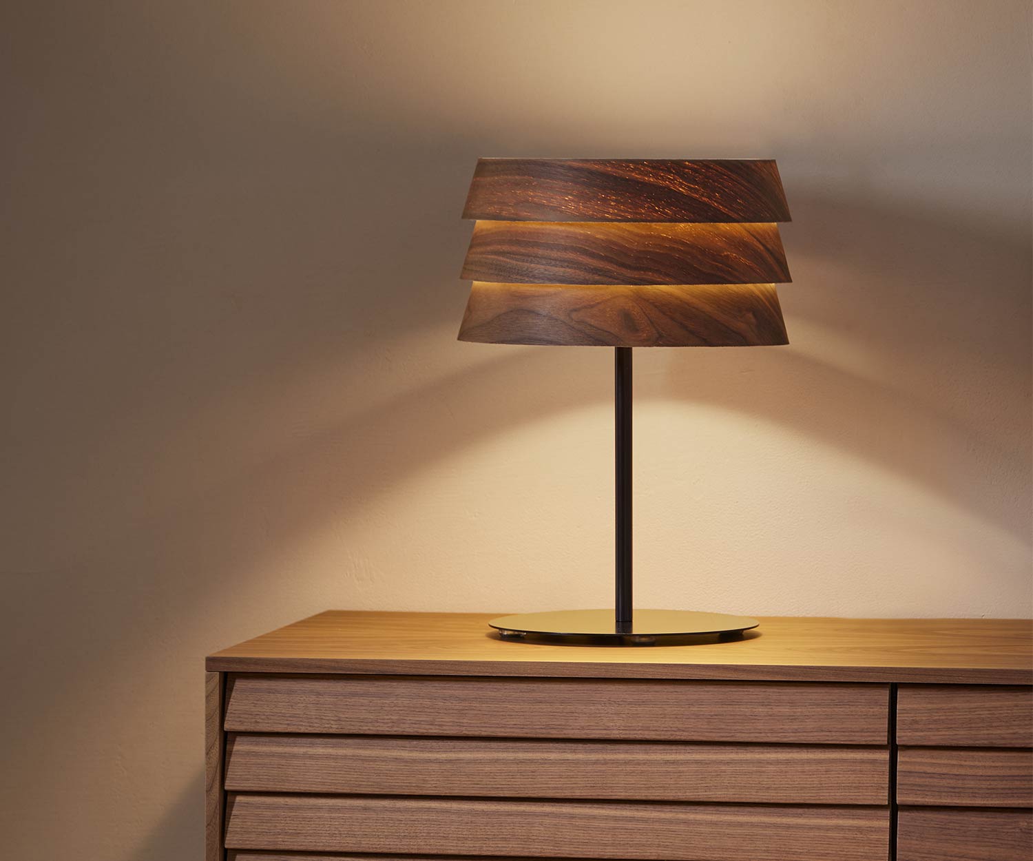 Materiali: L'impiallacciatura in noce scuro opaco o in frassino chiaro è classica e senza tempo, adatta a qualsiasi ambiente. La base in metallo è verniciata nel colore nero RAL9005 .