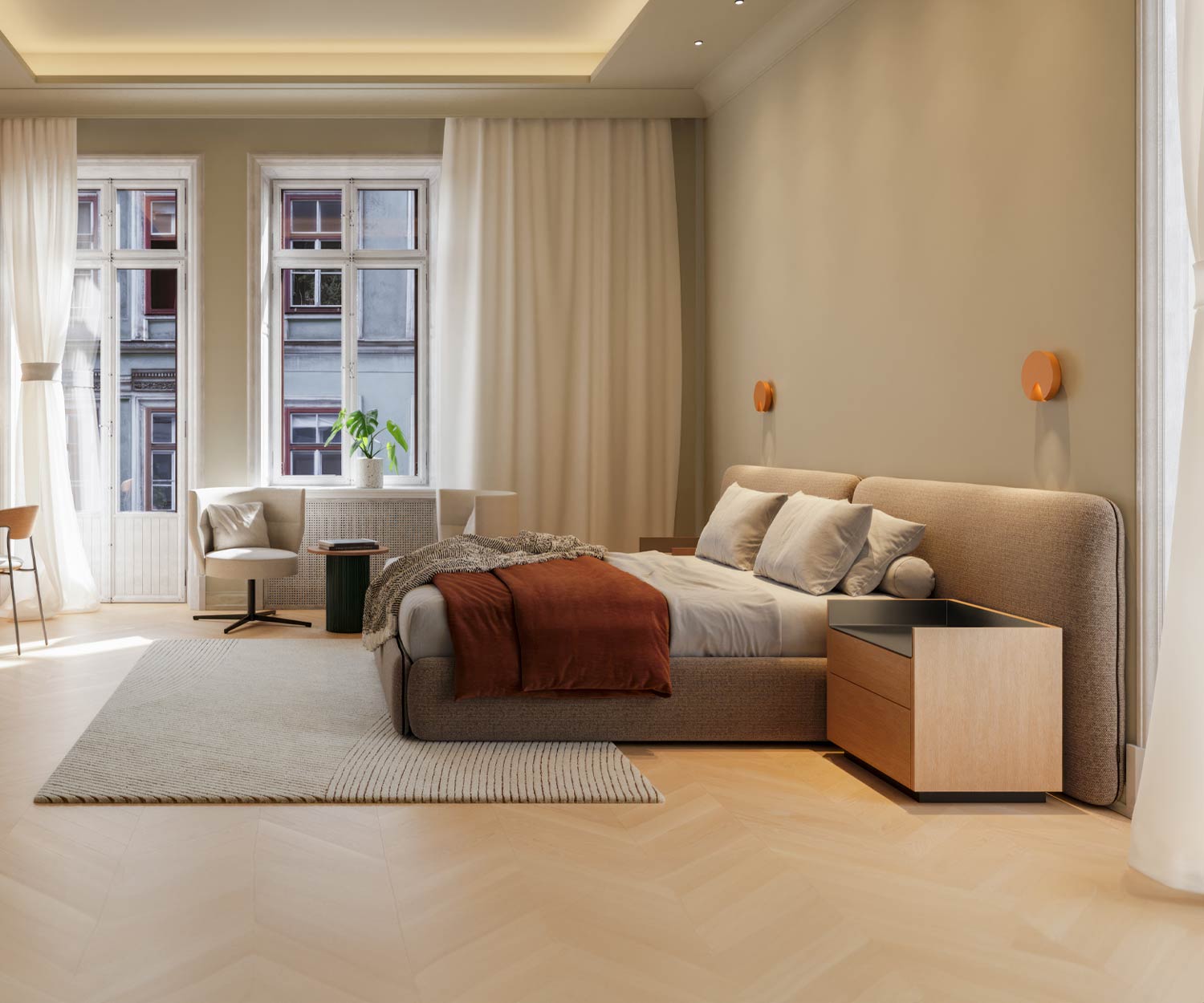 I due cassetti del comodino Punt Stockholm sono privi di maniglie e possono essere aperti e chiusi con la tecnologia push-to-open. Offrono un'estensione completa e scorrono in modo silenzioso, stabile e affidabile sulle guide Blum. Lo zoccolo è regolabile in altezza per compensare le irregolarità del pavimento.