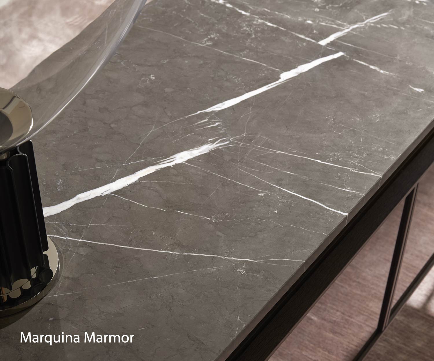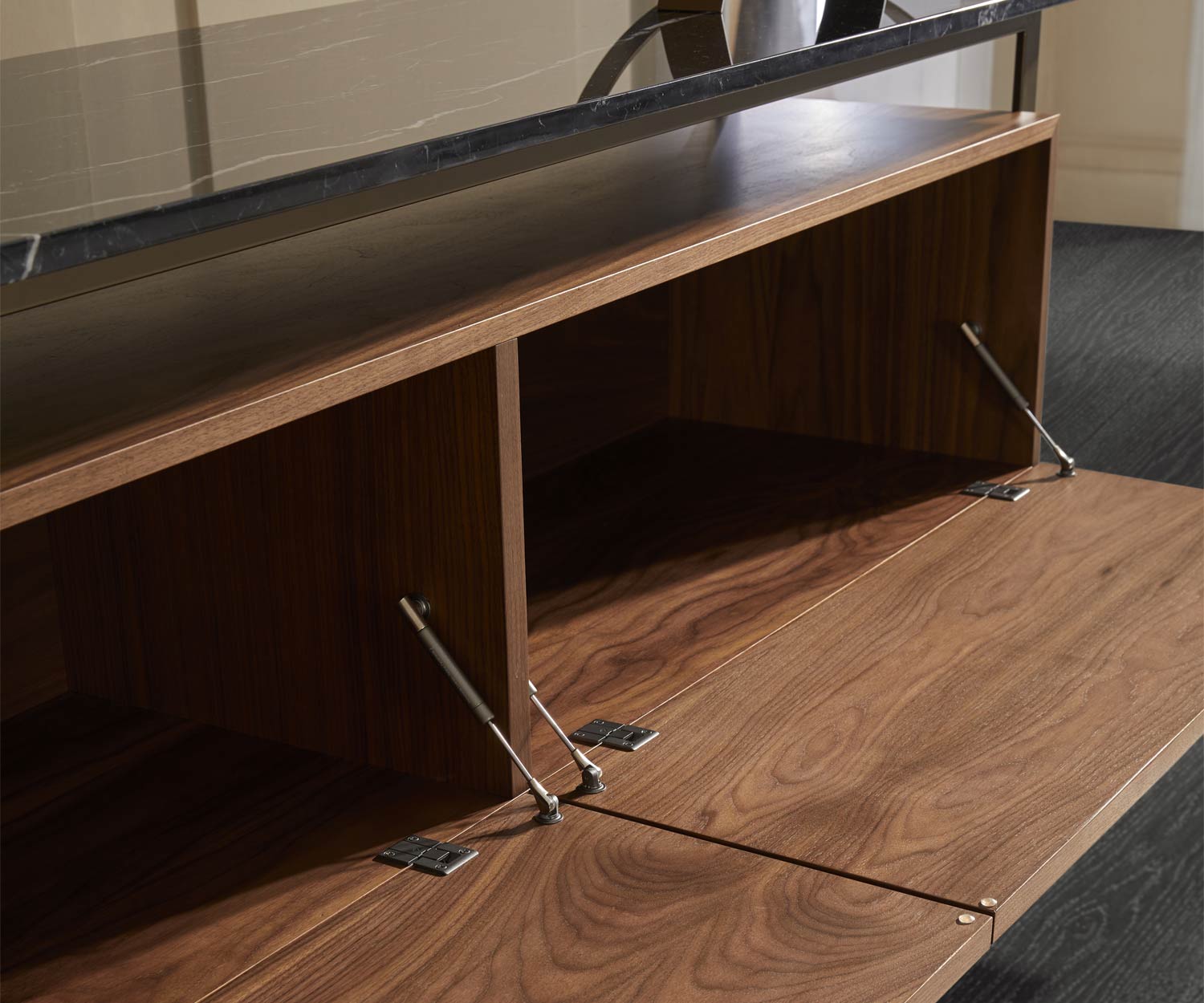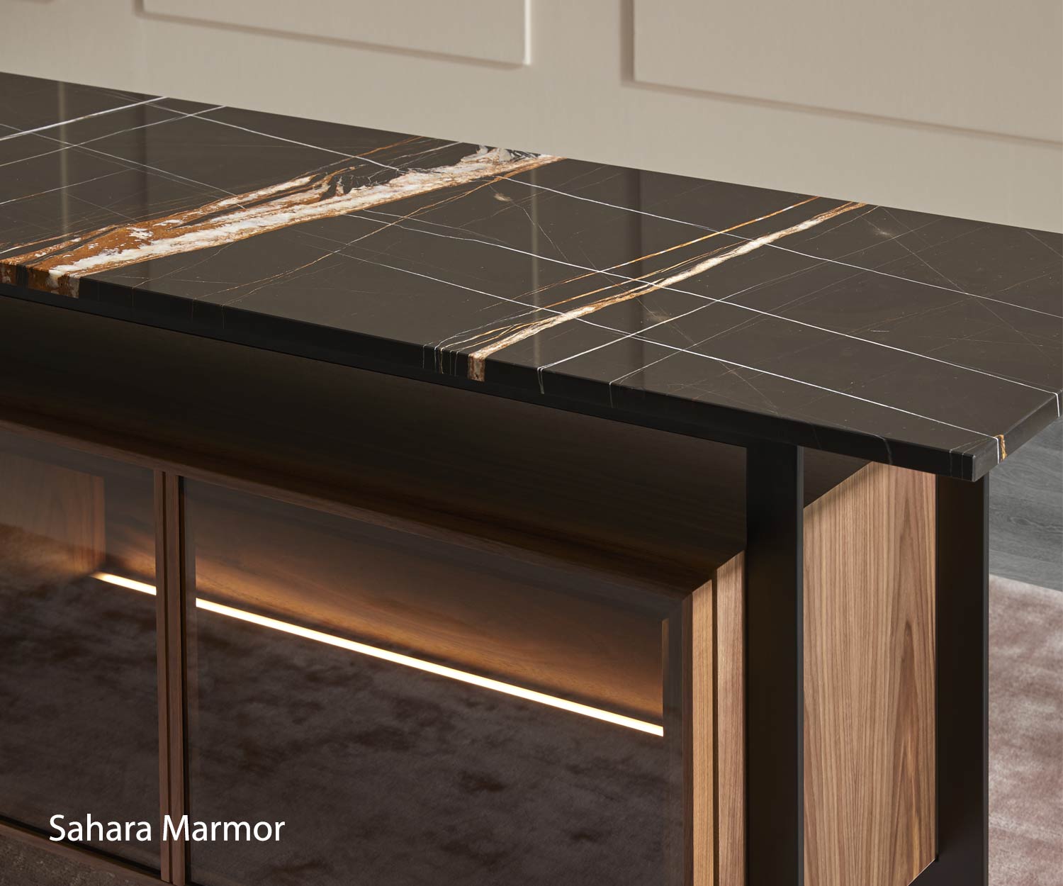 La struttura è realizzata con pannelli in MDF di classe E1, rifiniti con un'impiallacciatura in noce. rifinito con una pregiata impiallacciatura di noce. Il pannello di copertura è in marmo di alta qualità. La struttura metallica e i telai sono in acciaio. Le porte sono in vetro o in noce noce.