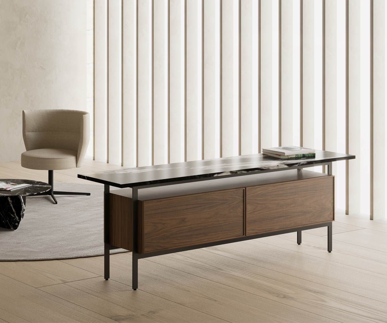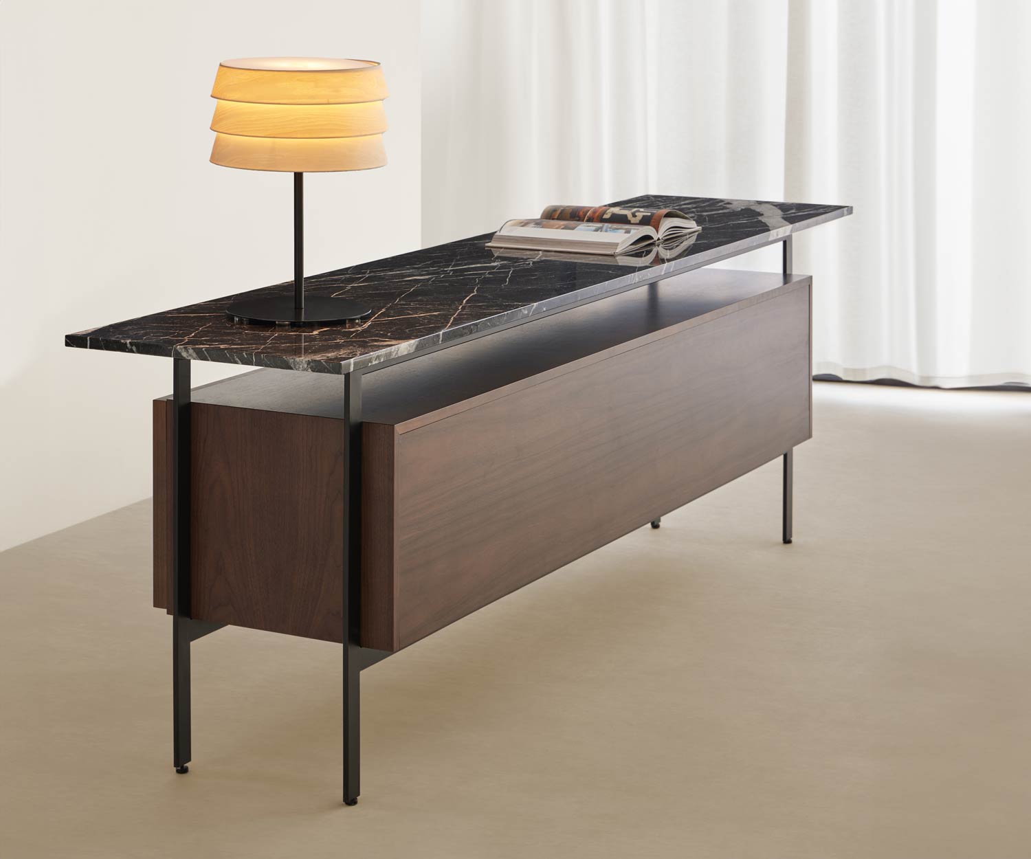 Con il suo design leggero e fluttuante, la credenza Punt Chicago design fluttuante rende omaggio a un'epoca particolare dell'architettura modernista. architettura. Da un lato, ciò è dovuto alla solida struttura in metallo, che che è sinonimo di stabilità, e il corpo in legno che la trasmette e la rafforza. e la rafforza. Il suo piano d'appoggio, come tetto galleggiante, collega i tre materiali naturali i tre materiali naturali utilizzati insieme alla struttura.