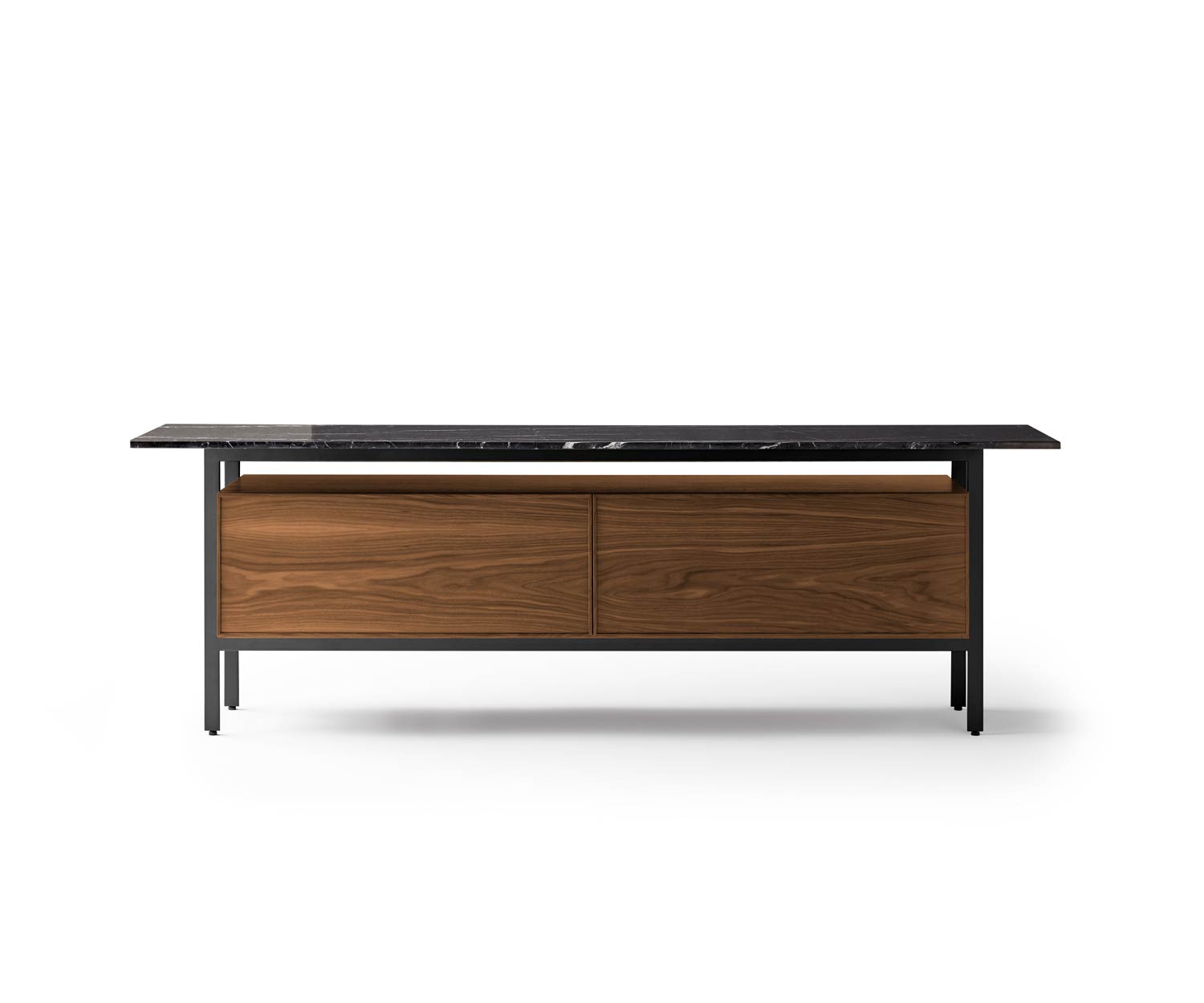 Con il suo design leggero e fluttuante, la credenza Punt Chicago design fluttuante rende omaggio a un'epoca particolare dell'architettura modernista. architettura. Da un lato, ciò è dovuto alla solida struttura in metallo, che che è sinonimo di stabilità, e il corpo in legno che la trasmette e la rafforza. e la rafforza. Il suo piano d'appoggio, come tetto galleggiante, collega i tre materiali naturali i tre materiali naturali utilizzati insieme alla struttura.