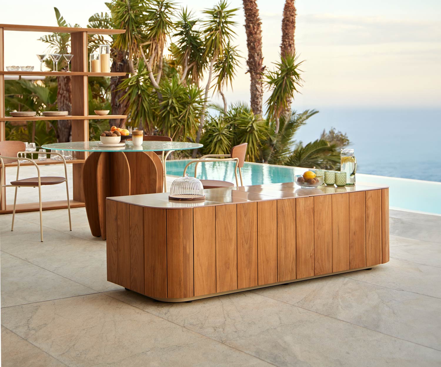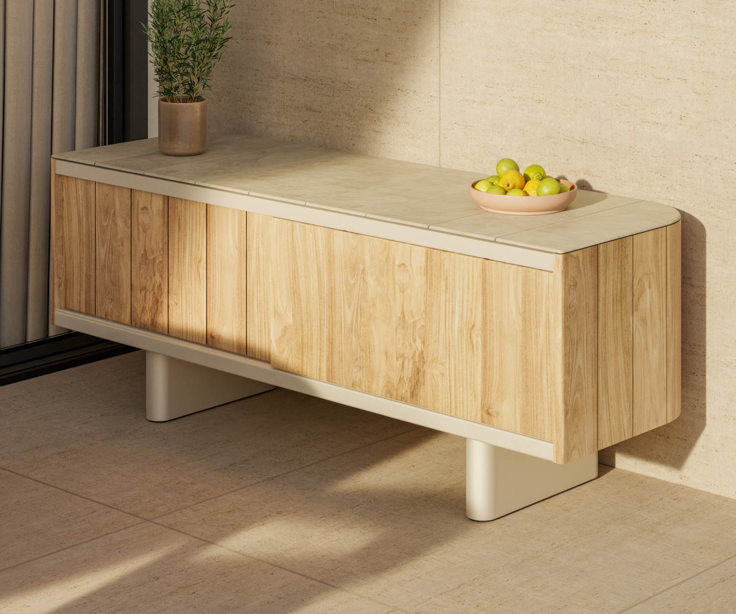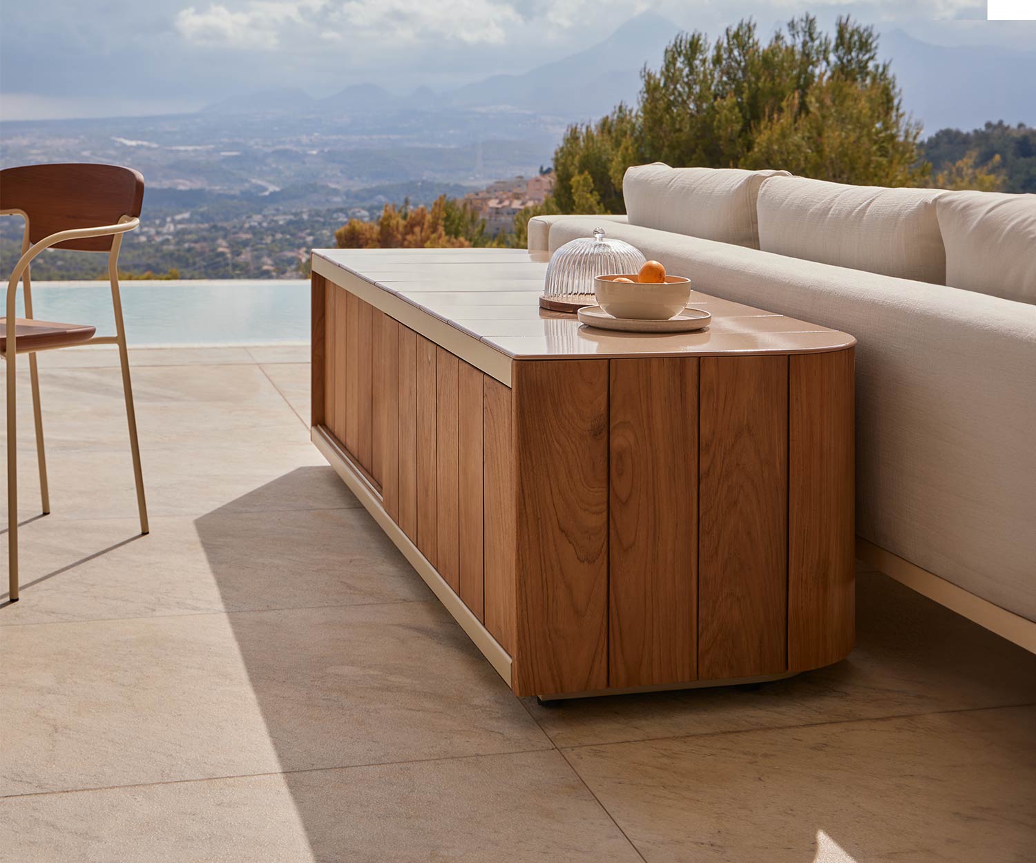 Con i suoi nuovi materiali - la combinazione di ceramica di alta qualità e teak - la credenza per esterni Atrio offre