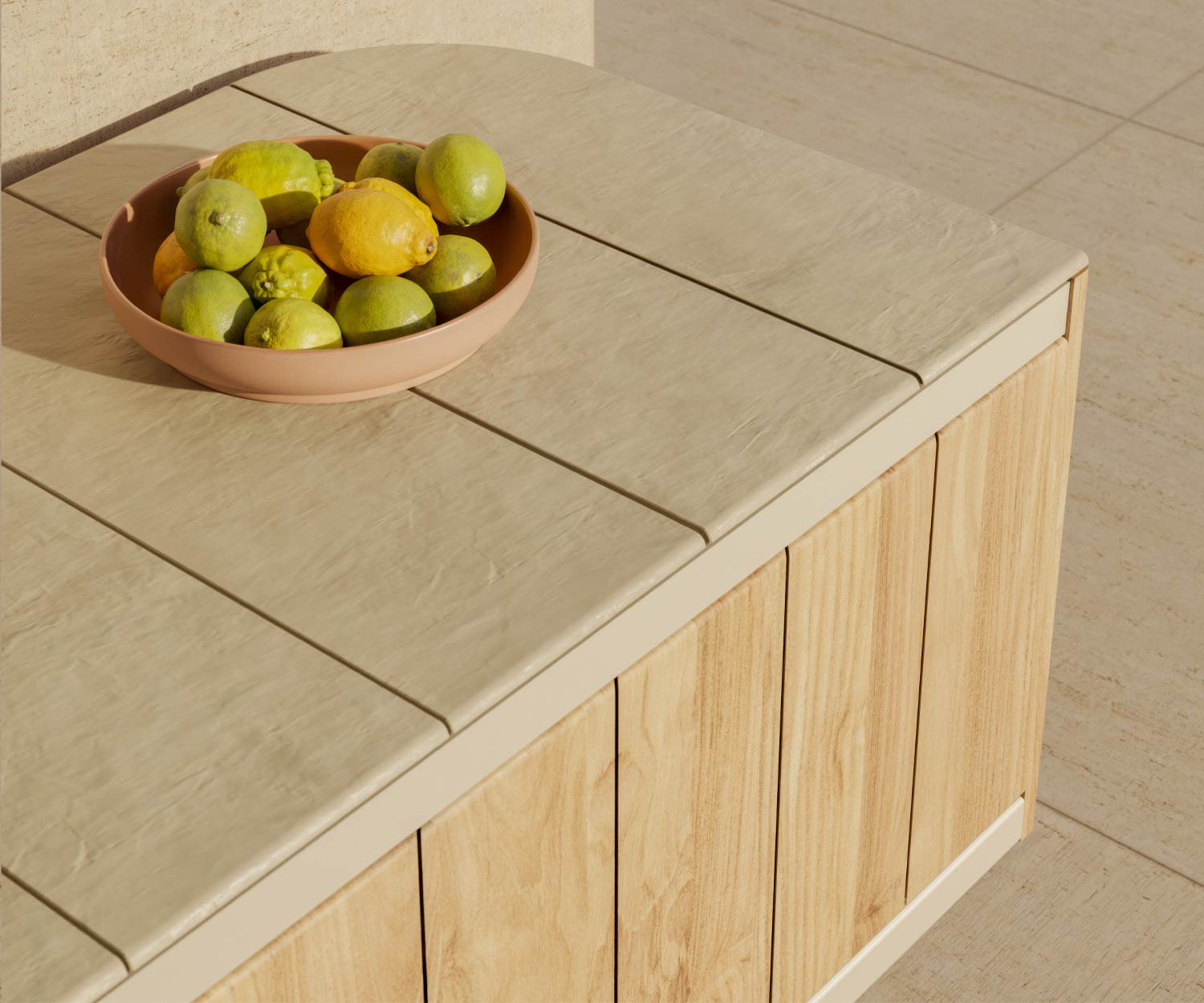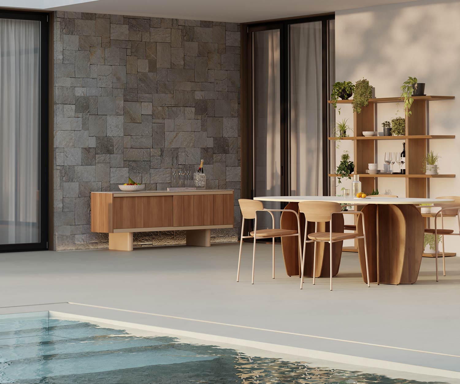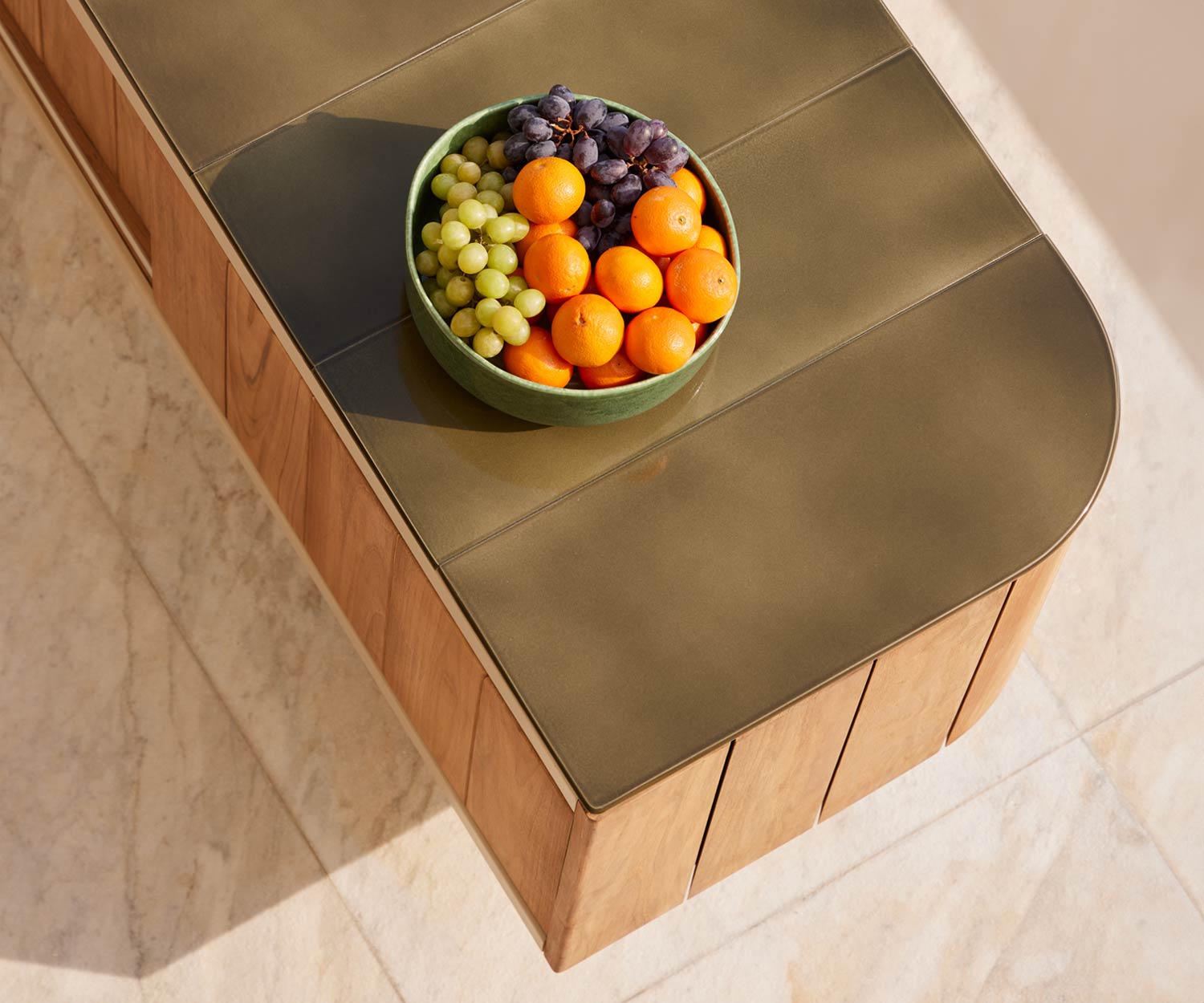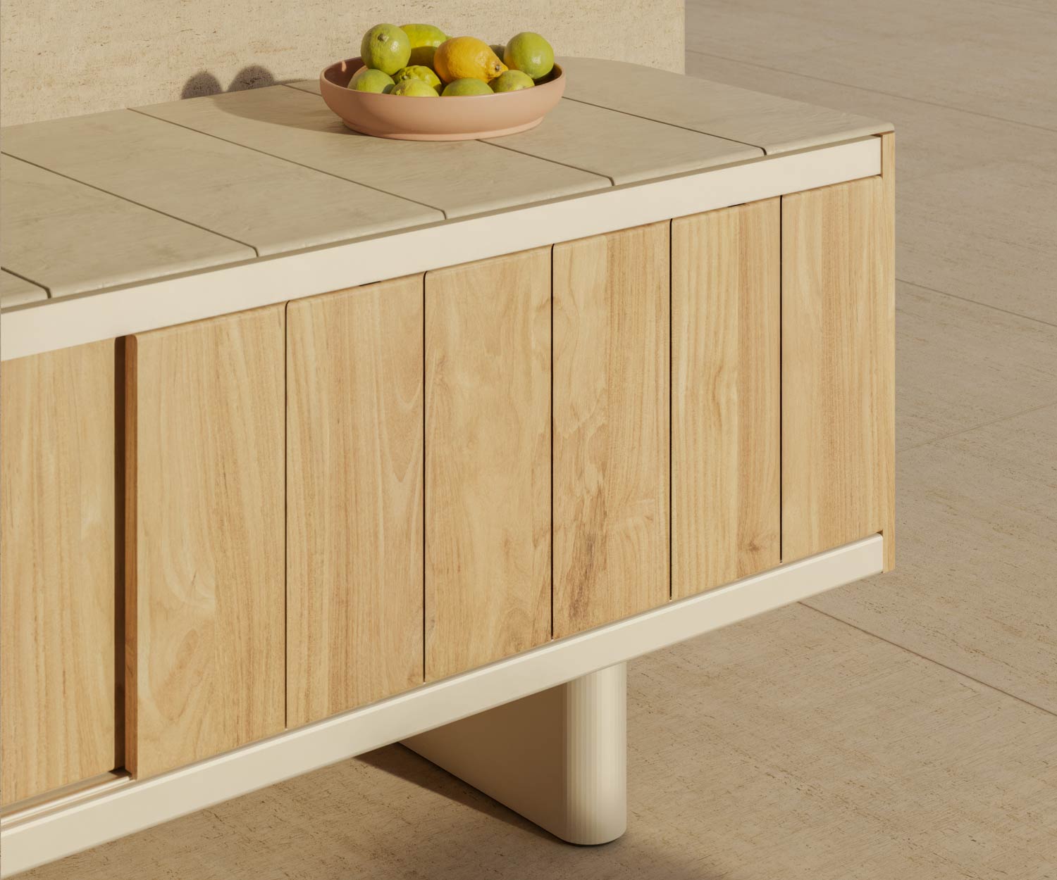 Con i suoi nuovi materiali - la combinazione di ceramica di alta qualità e teak - la credenza per esterni Atrio offre