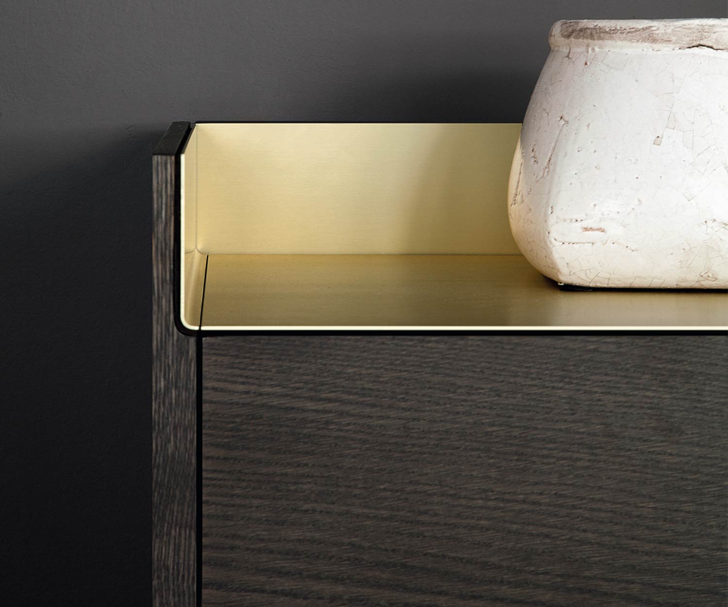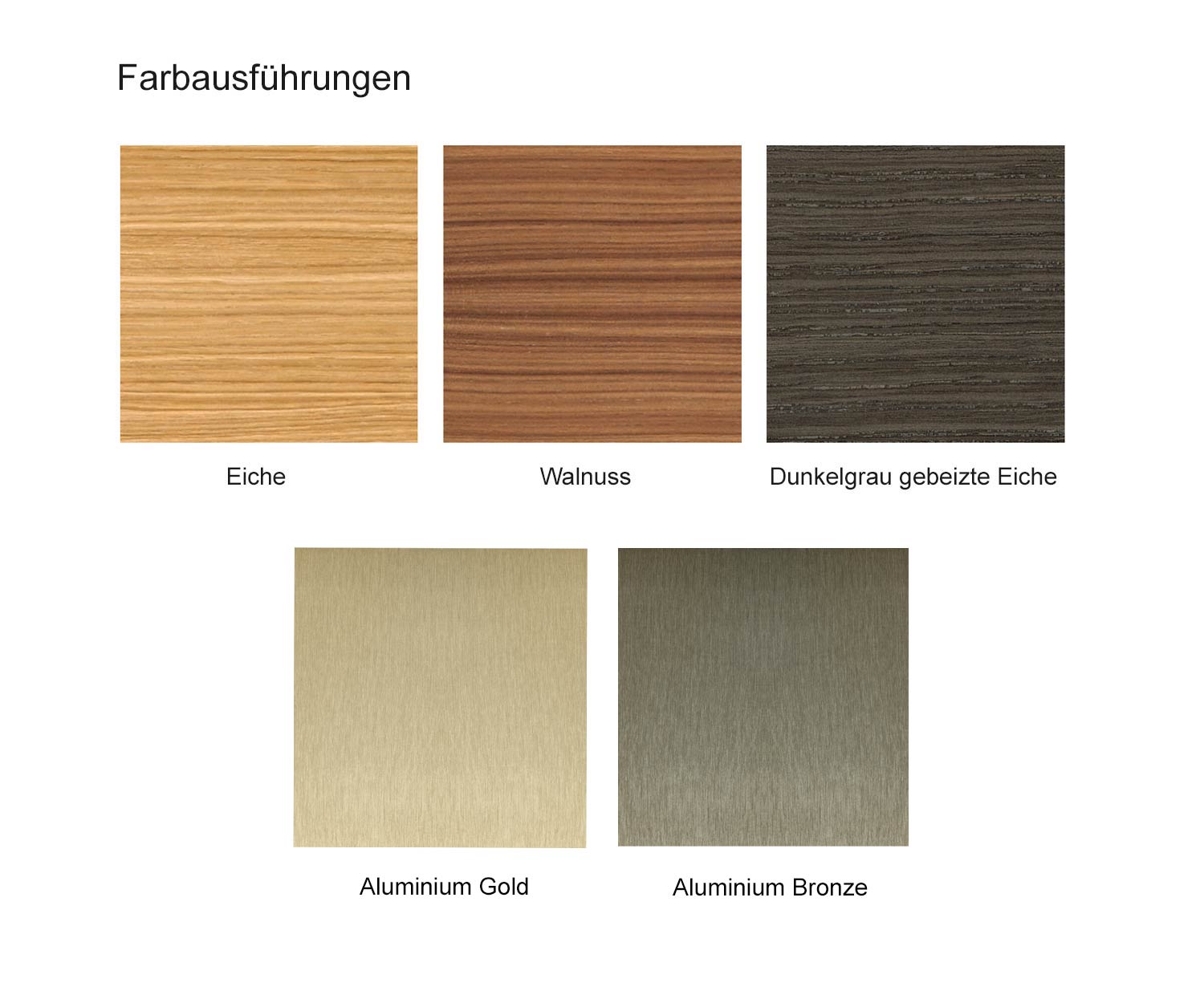 Le impiallacciature utilizzate sono disponibili in rovere super opaco, noce super opaco o rovere tinto grigio scuro (Rovere tinto grigio scuro) . La piastra di copertura è disponibile nei colori alluminio oro, alluminio bronzo e alluminio rosa . I piedi sono disponibili nel colore nero RAL 9005.