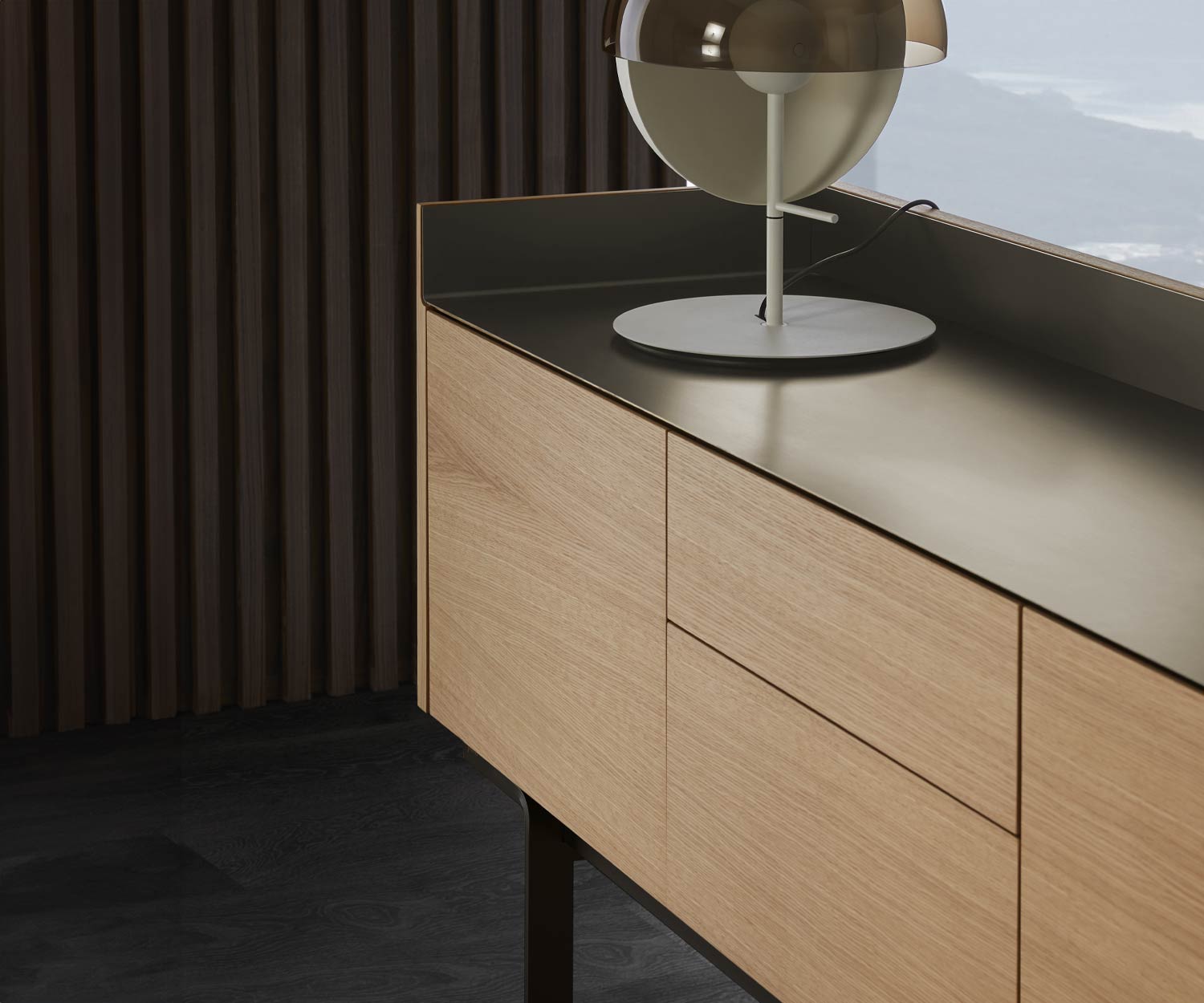Le sezioni interne ed esterne della credenza Punt Stockholm sono realizzate con pannelli in MDF E1 e truciolato E1, rifiniti con un'impiallacciatura in rovere o noce/noce e rivestiti con un motivo continuo di impiallacciatura. La piastra di copertura è in alluminio anodizzato. Il corpo poggia su una base in acciaio con superficie verniciata a polvere.