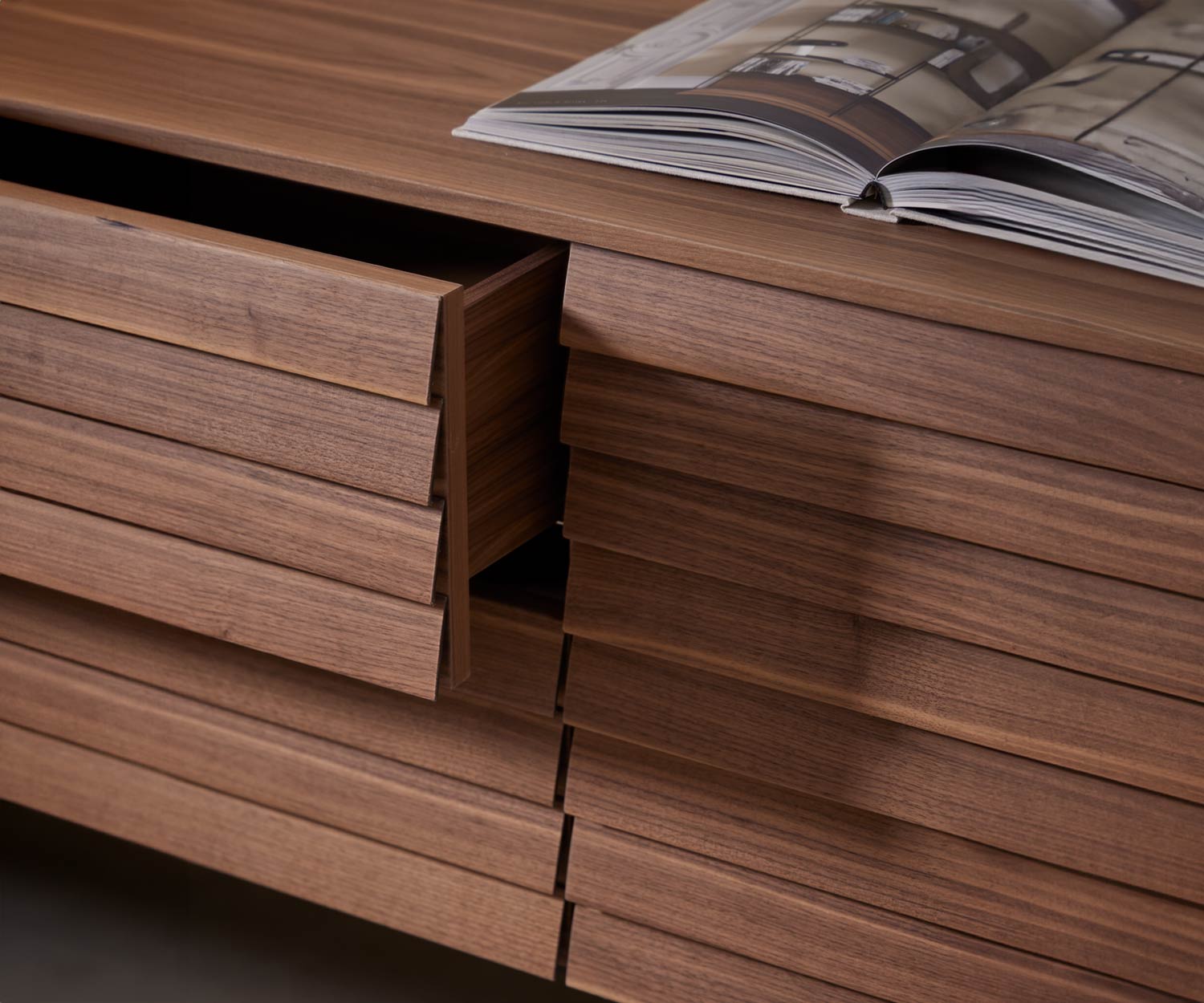 A seconda delle esigenze, ogni larghezza della credenza Punt Design Sussex può essere ordinata con gambe piatte da 2 cm o alte 28 cm. La versione alta viene spesso utilizzata come mobile TV. Per la credenza Punt Sussex vengono utilizzati esclusivamente binari scorrevoli di alta qualità prodotti da Hettich in Germania. Il frontale a doghe della credenza funge anche da maniglia invisibile e si integra perfettamente nel design. La differenza tra anta e cassetto è invisibile. Grazie alle guide Hettich, i cassetti sono particolarmente silenziosi e si chiudono sempre automaticamente(tecnologia di ammortizzazione soft-close). Il meccanismo di chiusura automatica soft-close viene utilizzato anche per le ante.