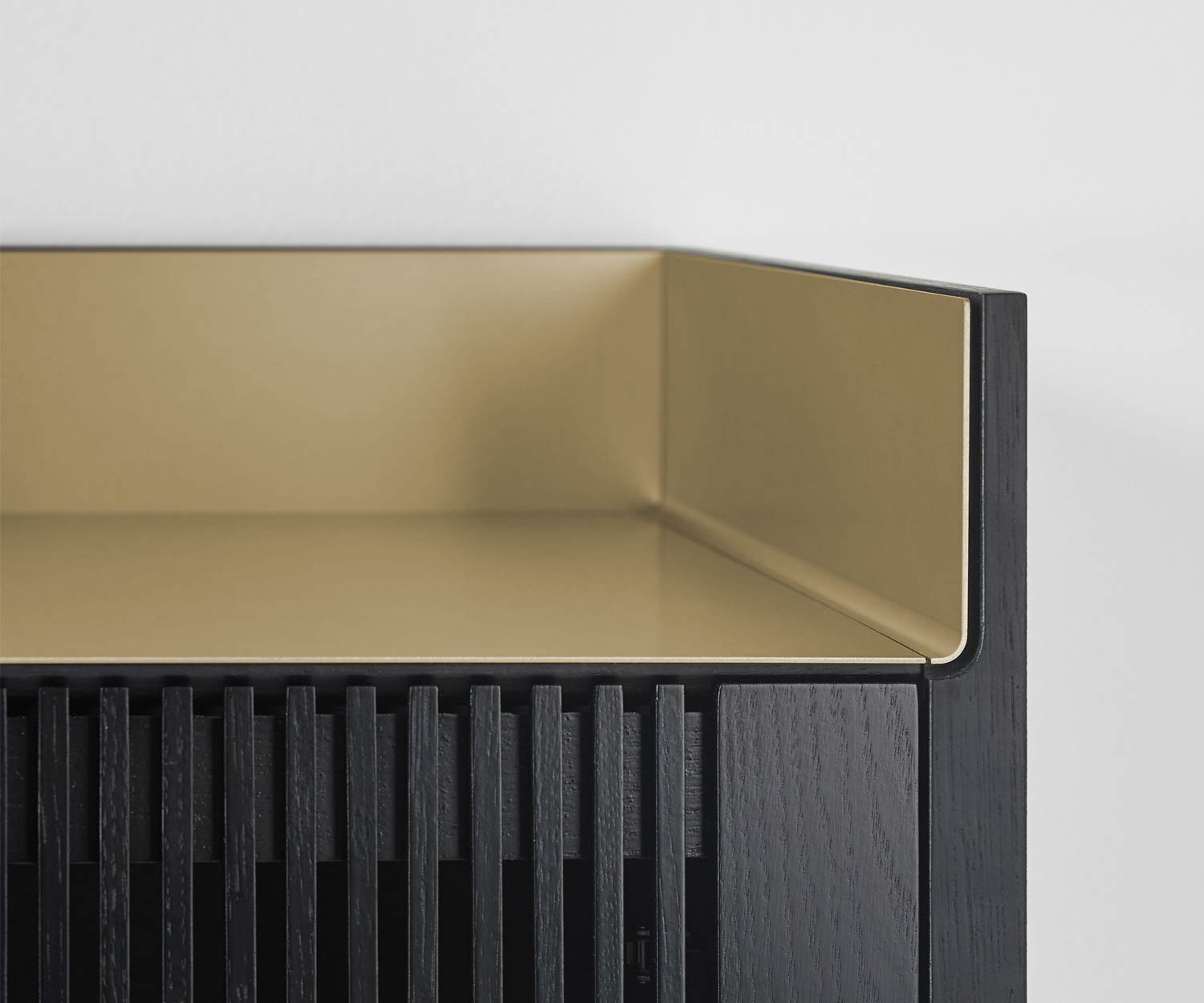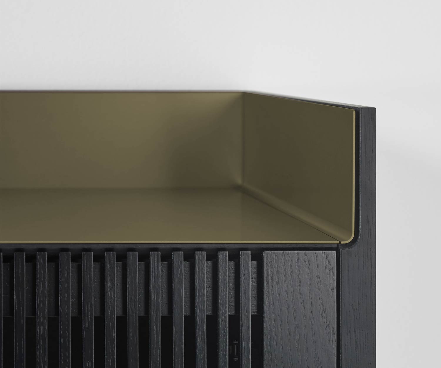La piastra di copertura è disponibile nei colori alluminio oro, alluminio bronzo e alluminio rosa . La scocca e il frontale sono disponibili in rovere super opaco, noce super opaco o rovere tinto scuro (rovere tinto ebano). I piedi sono disponibili nel colore nero RAL9005.