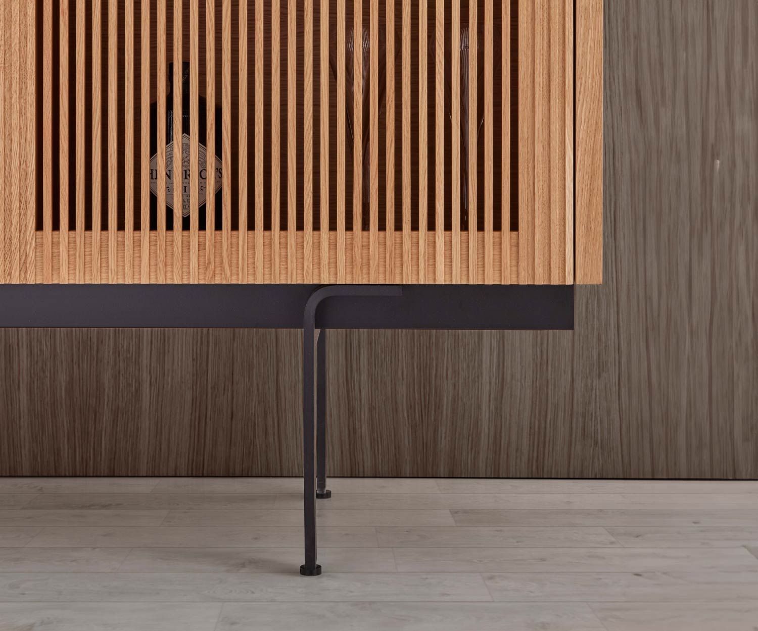 Le sezioni interne ed esterne della credenza Punt Stockholm sono realizzate in MDF E1 e truciolato E1. Sono rifinite con impiallacciatura in rovere o noce e presentano un motivo di impiallacciatura continua e rivestita. La finitura del pannello di copertura è in alluminio anodizzato. Come già detto, l'anta destra è rifinita con impiallacciatura in rovere o noce, ma le doghe utilizzate sono in rovere o noce massiccio. Il corpo poggia su una base in acciaio con piedini verniciati a polvere.