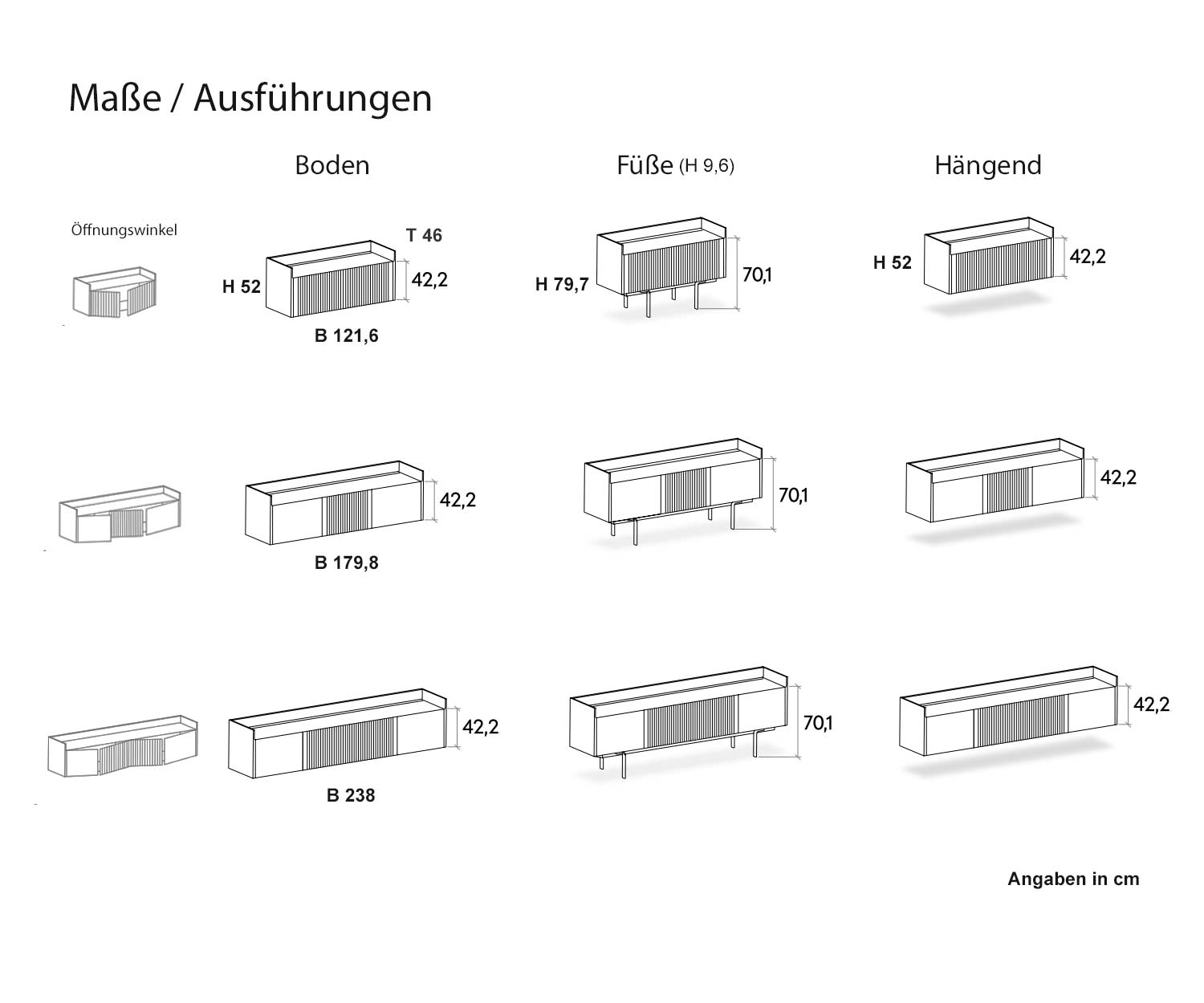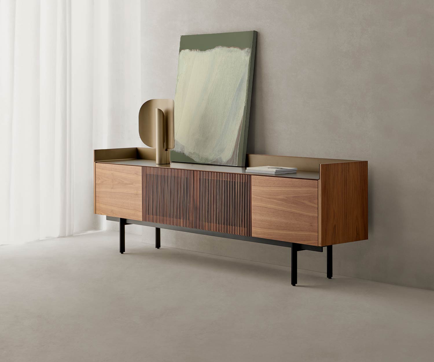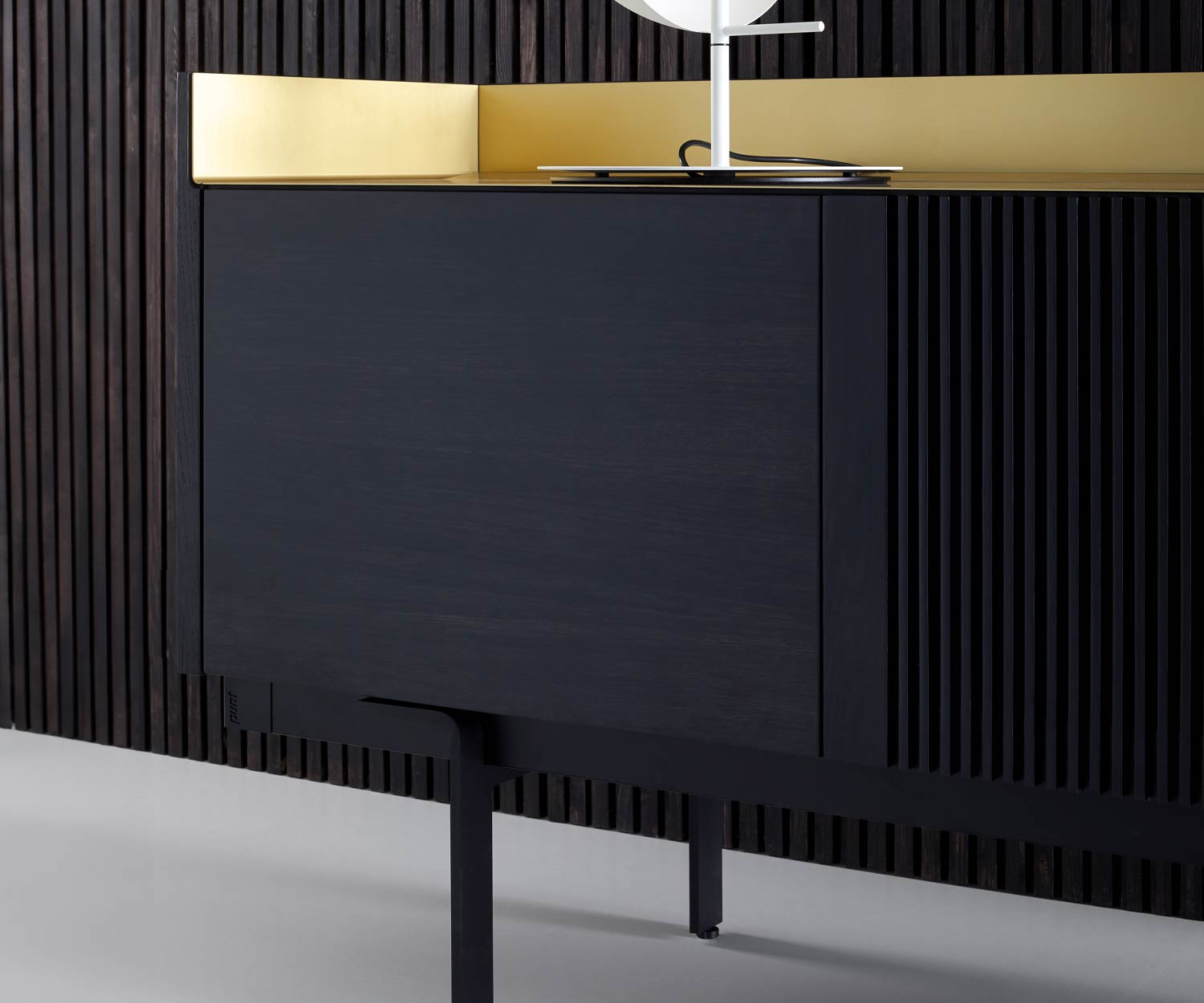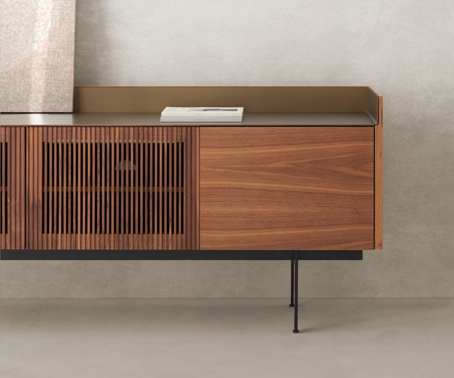 La struttura e le ante chiuse sono realizzate in robusto MDF E1 e truciolato E1 (a basso contenuto di formaldeide). Sono rifiniti con impiallacciatura in vero legno . Il motivo dell'impiallacciatura si estende a tutte le ante e non si interrompe. Le ante a doghe sono realizzate in rovere massiccio o in noce, a seconda della versione. La piastra di copertura è in alluminio laminato e anodizzato. I piedini opzionali sono costituiti da una base in acciaio con superficie termolaccata e testurizzata.