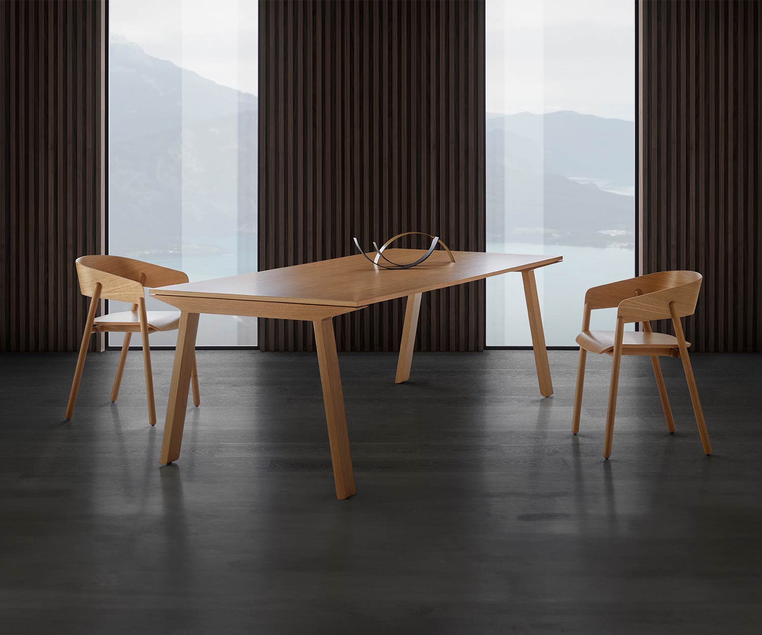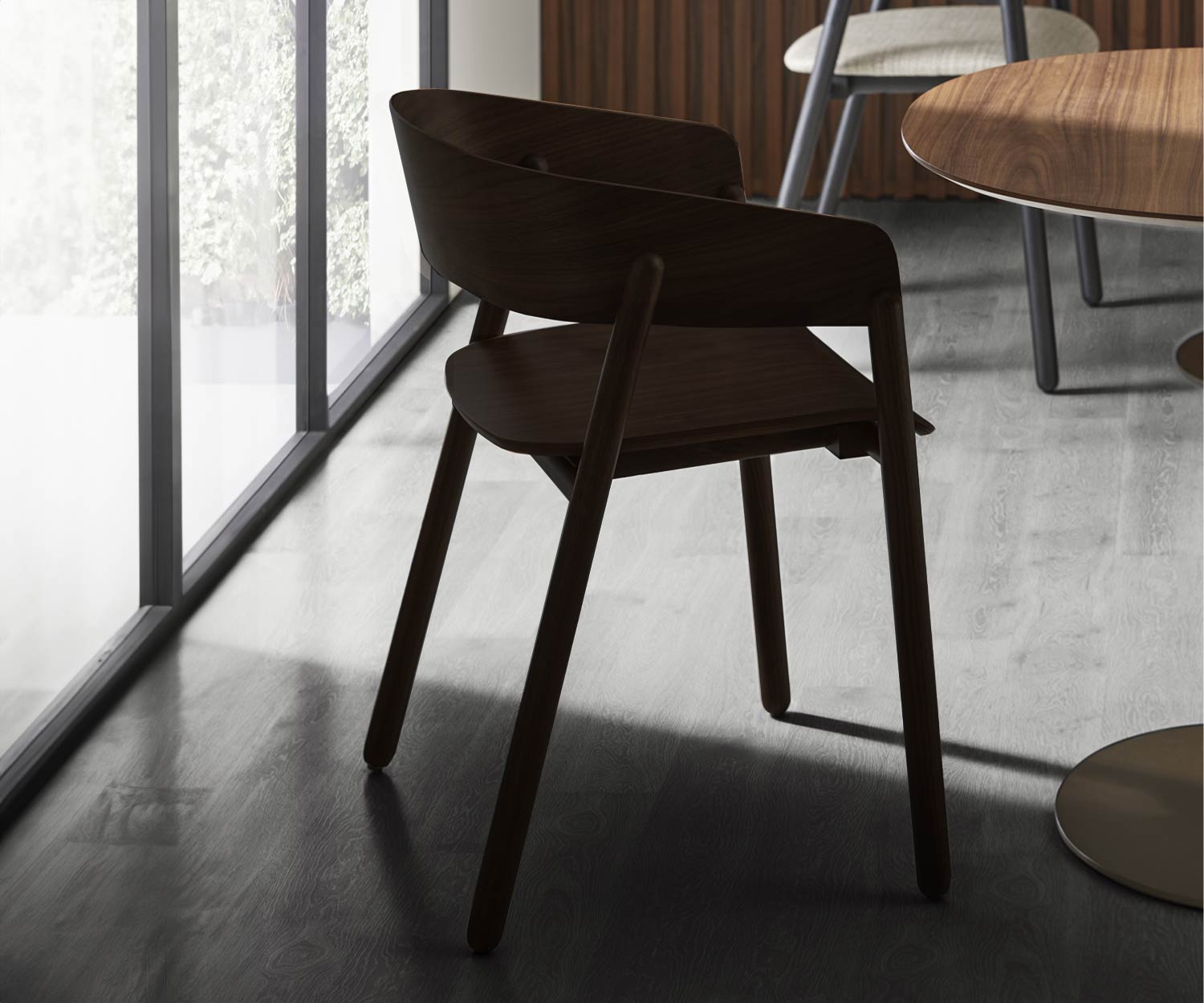 La sedia di design Mava di Punt è realizzata su ordinazione in Spagna. La produzione avviene a mano. La struttura è in legno massiccio di quercia o noce. La seduta e lo schienale sono in compensato sagomato con impiallacciatura in vero legno di noce o rovere. Le gambe sono dotate di piedini in feltro integrati.