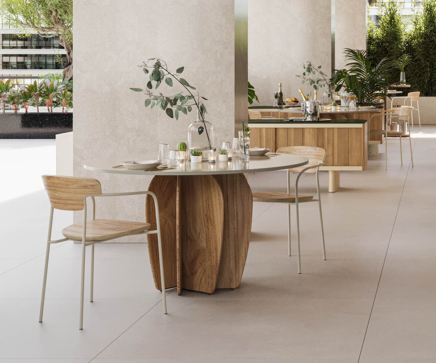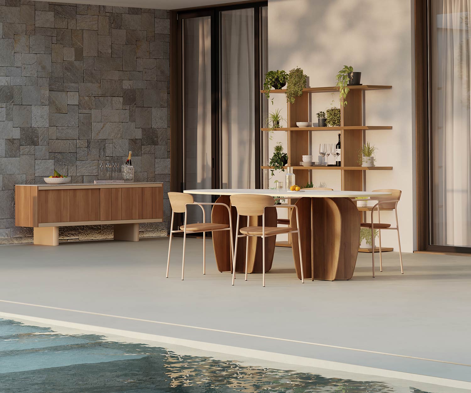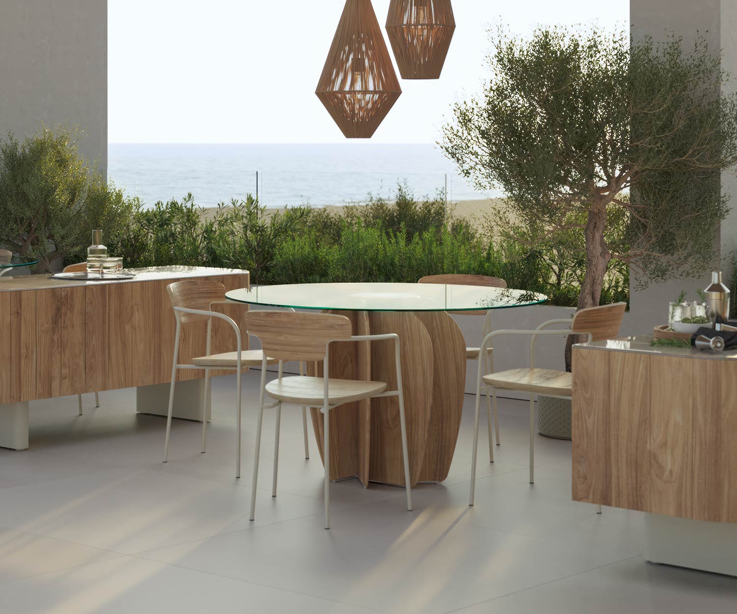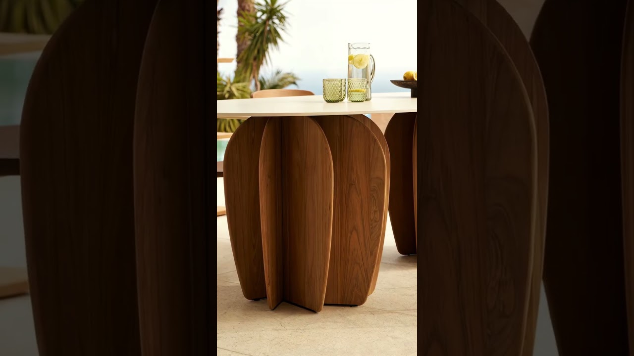 ,il tavolo da pranzo Coral offre un ambiente autentico grazie ai suoi nuovi materiali, teak e argilla, ed è allo stesso tempo resistente agli agenti atmosferici. Il design di alta qualità delle gambe del tavolo trasformerà il vostro patio in qualcosa di speciale. Punt L 'esclusiva credenza Atrio per esterni è disponibile in abbinamento al tavolo da pranzo Coral.