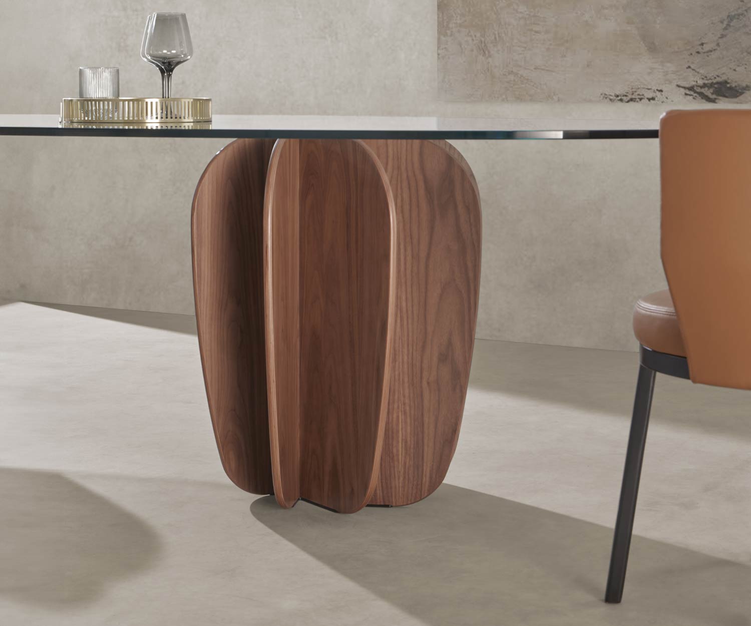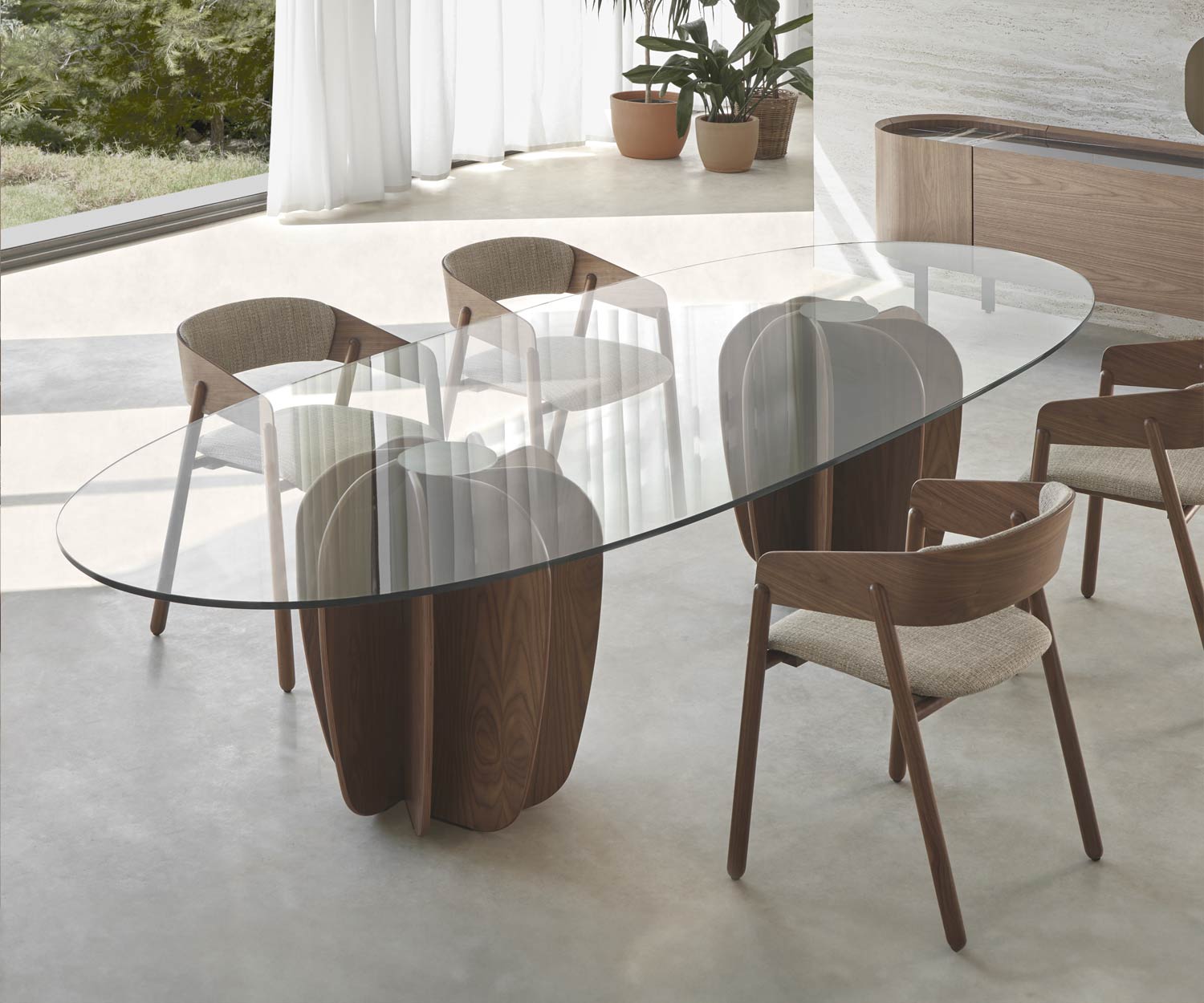 Punt Il tavolo da pranzo di design Coral è disponibile con la gamba del tavolo in teak naturale. Il piano del tavolo è disponibile in vetro trasparente o in alluminio Dekton. Una piastra in acciaio inox collega il piano in vetro alla gamba in legno.