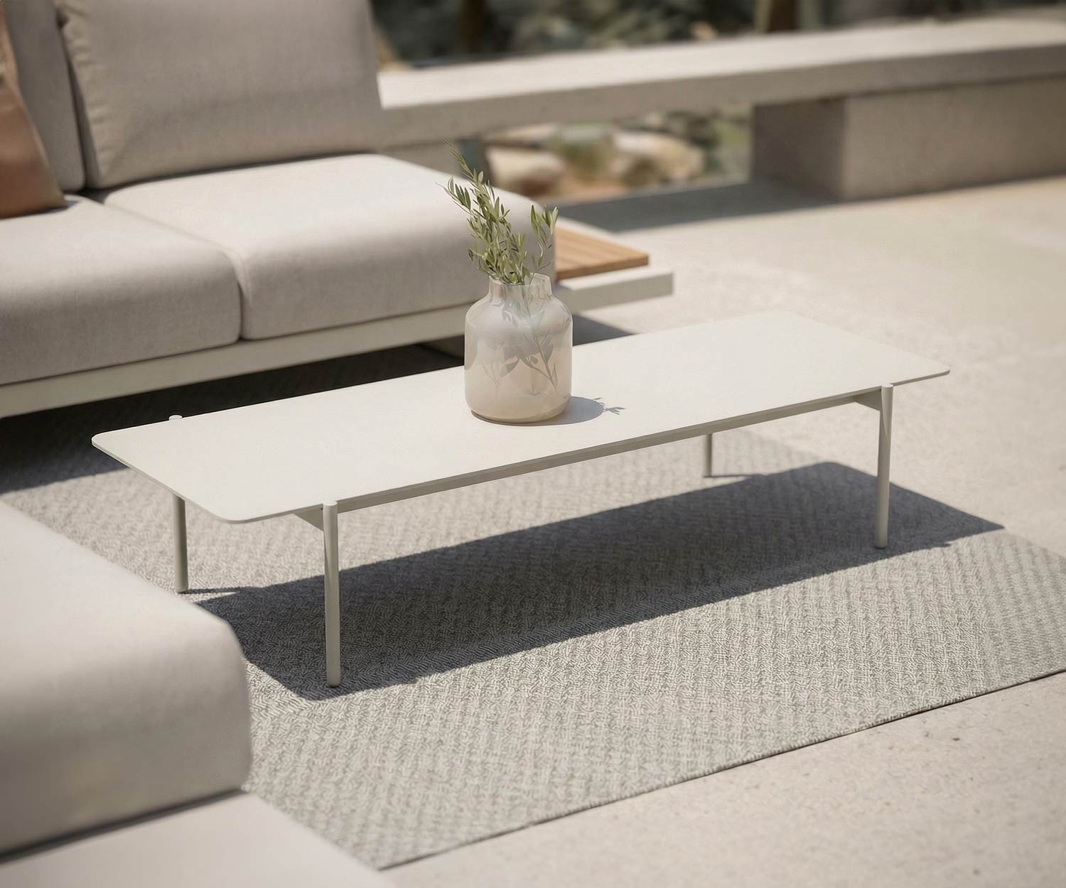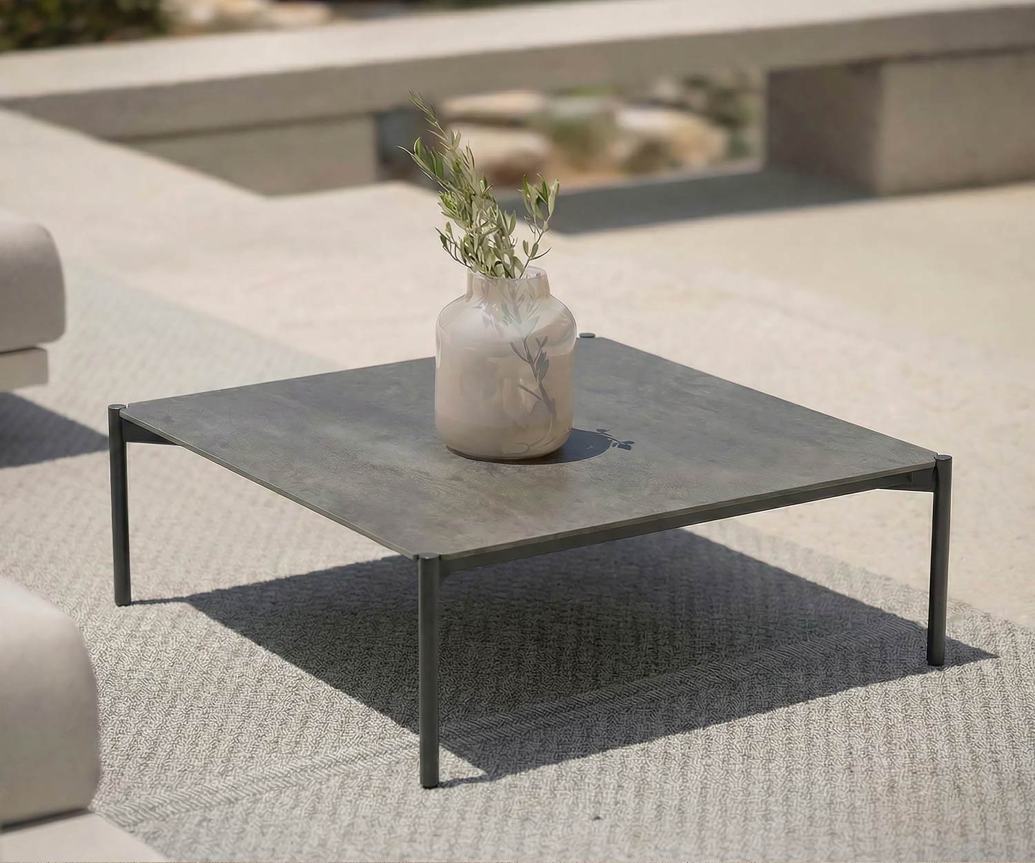 Das robuste Gestell des Dongo Outdoor Couchtisches besteht aus matt lackiertem, pulverbeschichtetem Edelstahl und ist in den eleganten Farben Creme Weiß (115) oder Anthrazit (145) erhältlich.